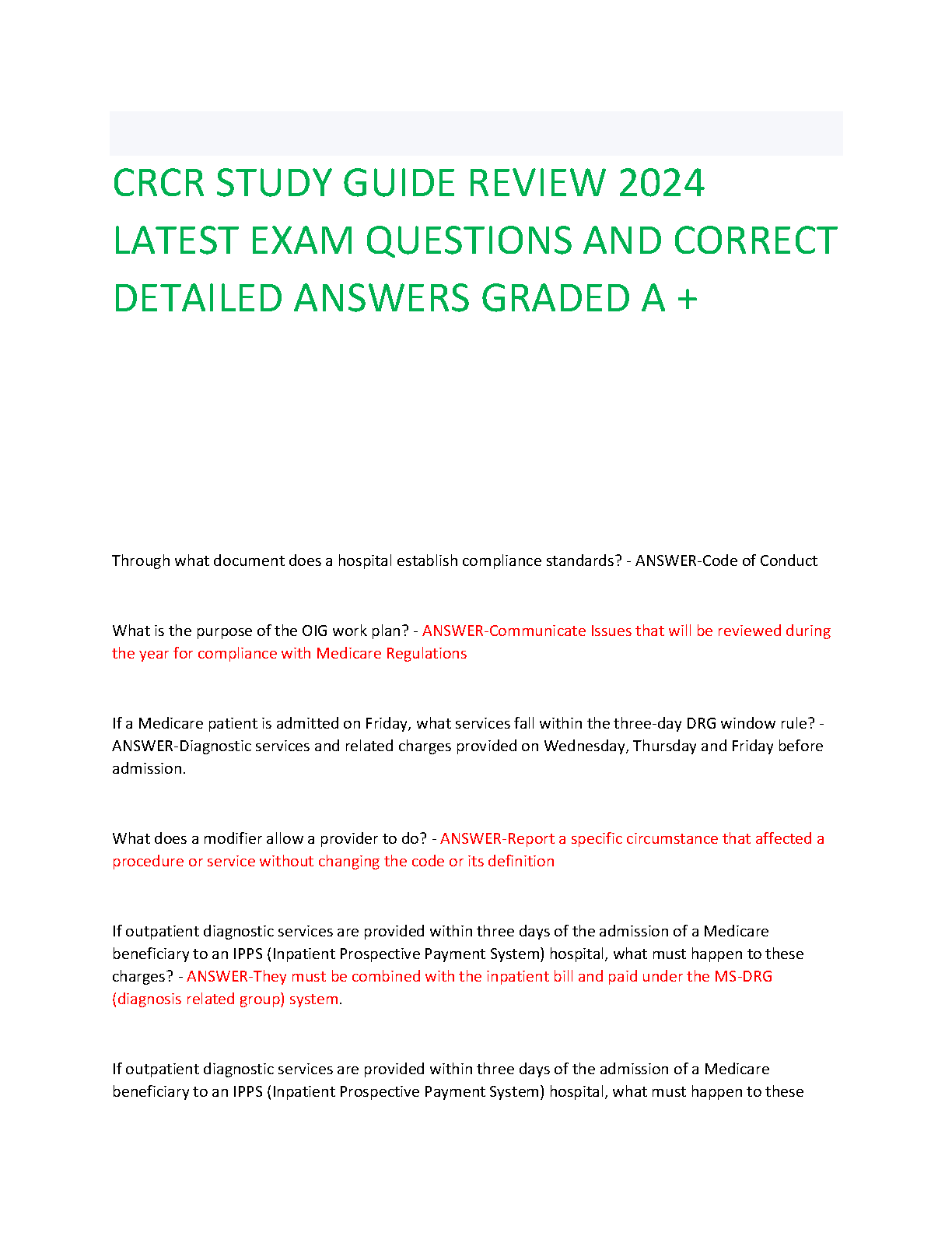 Master the HFMA Certified Revenue Cycle Representative exam with our ultimate 2025/2026 Test Bank. This comprehensive study guide is packed with the latest CRCR exam questions and detailed, A+ graded answers to ensure you pass on your first try. Deep dive into essential topics like hospital compliance, OIG work plans, Medicare regulations, the three-day DRG window rule, and IPPS. Our resource is meticulously designed to provide you with the knowledge and confidence needed to avoid resits and accelerate your career in healthcare finance. Prepare effectively and achieve certification success with this essential prep tool.