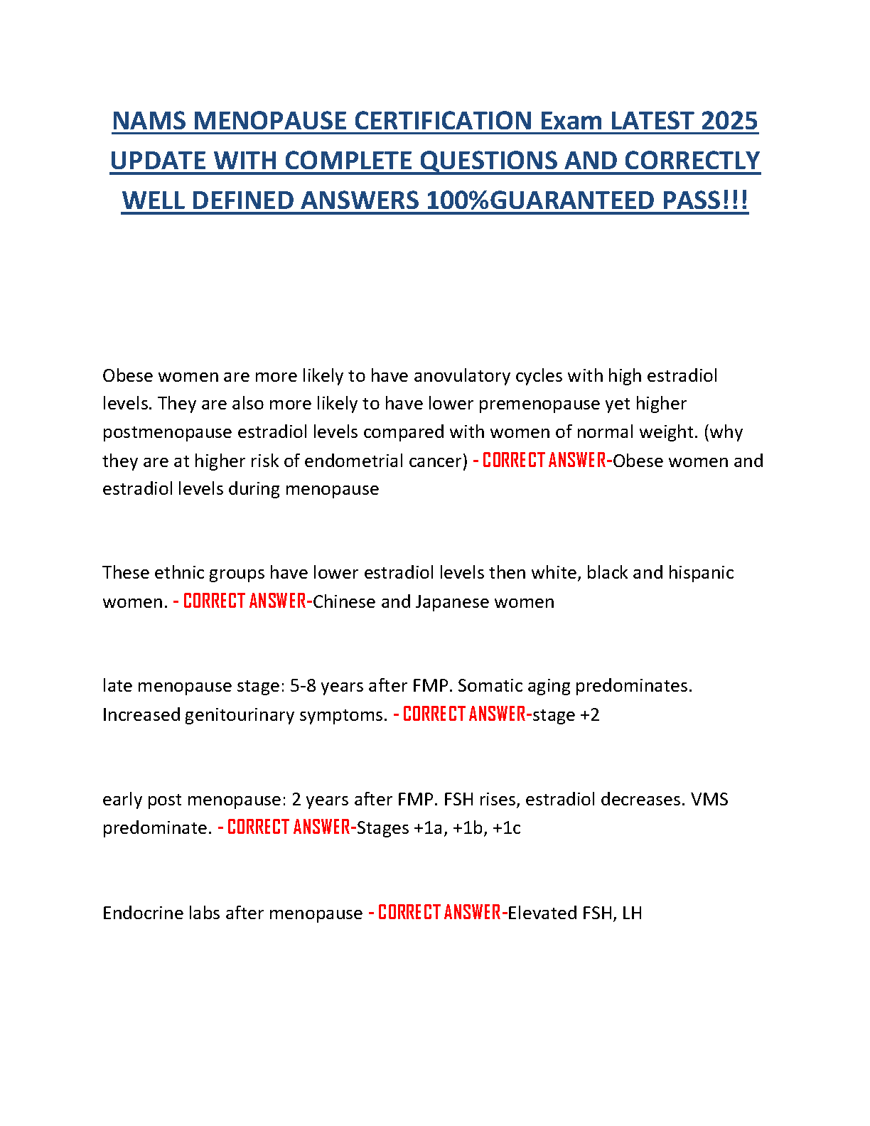The North American Menopause Society (NAMS) NCMP Certification Exam Test Bank 2025 with 100% Correct Questions and Answers