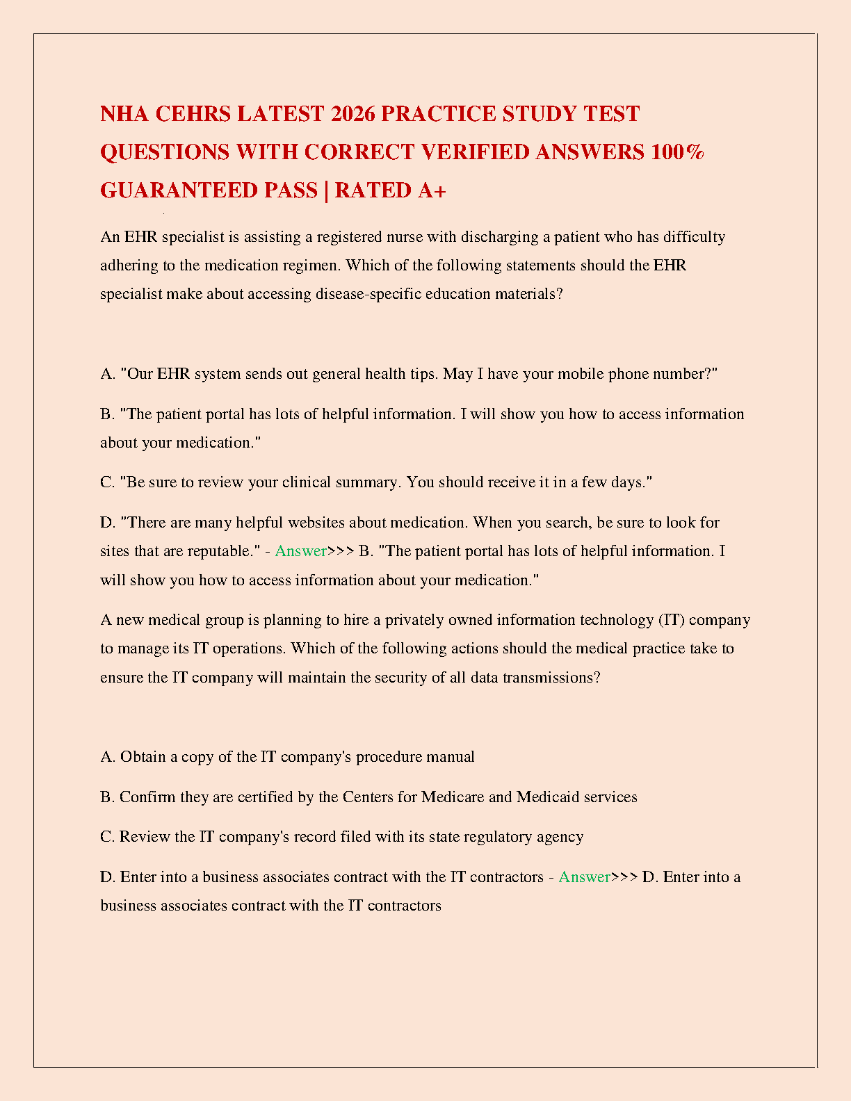 Ace your NHA Certified Electronic Health Record Specialist (CEHRS) exam with our definitive 2026 Test Bank. This essential study resource provides a complete collection of practice questions, each paired with a 100% correct and verified answer. Meticulously compiled to reflect the latest exam syllabus, this guide is your key to mastering the material, boosting your confidence, and securing an A+ grade on your first try. Prepare effectively and take the next step in your healthcare IT career with this top-rated study solution.