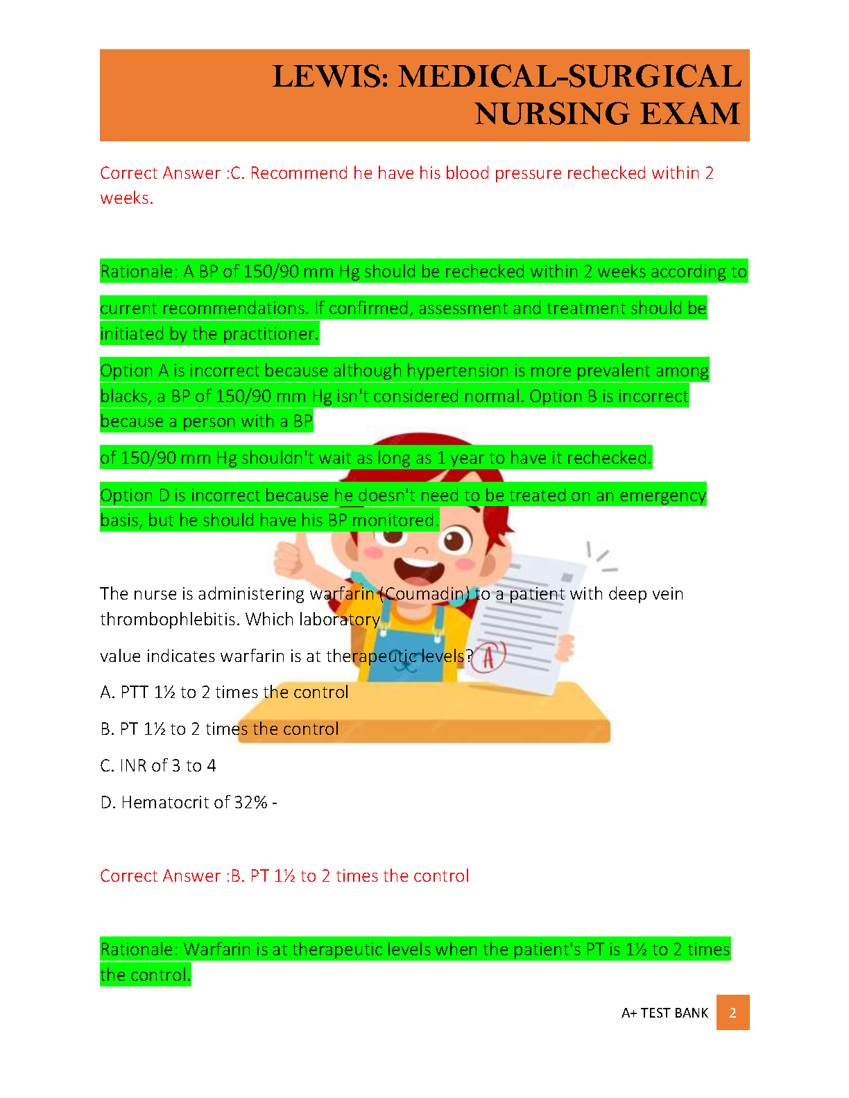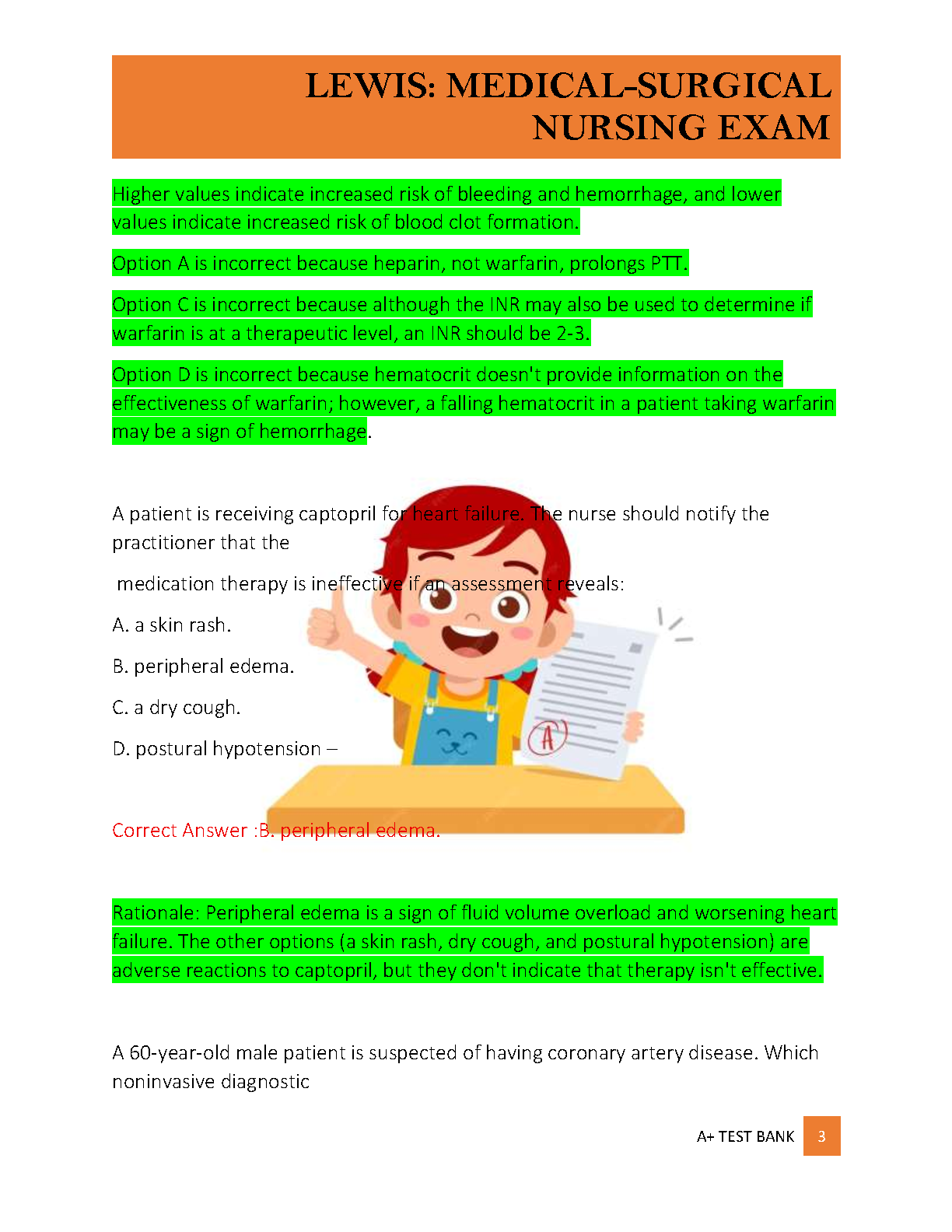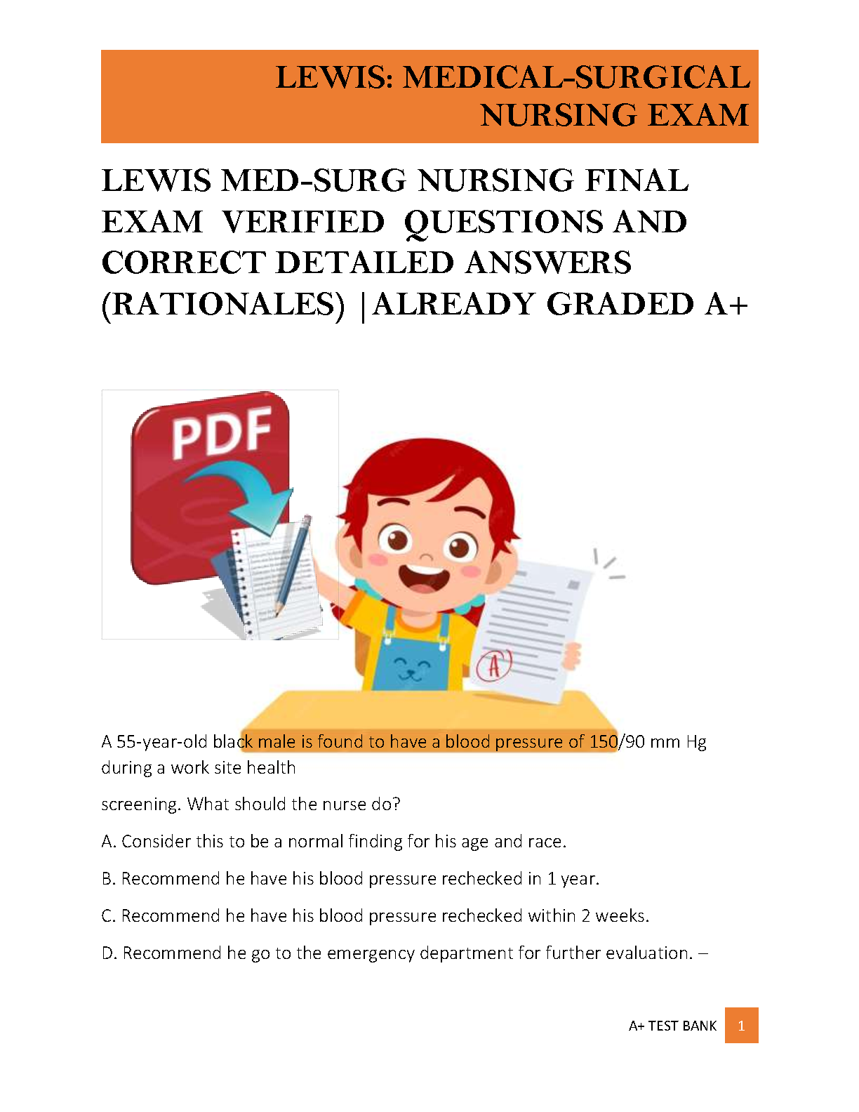 Master your medical-surgical nursing course with this complete Test Bank for the 12th Edition of Lewis's Medical-Surgical Nursing by Harding, Kwong, Roberts, Hagler, and Reinisch. This A+ graded resource contains a vast collection of verified exam questions, detailed answers, and comprehensive rationales to ensure you understand the core concepts. Ideal for exam preparation, this study guide helps you practice with real test-style questions, build confidence, and achieve top grades in your nursing program.