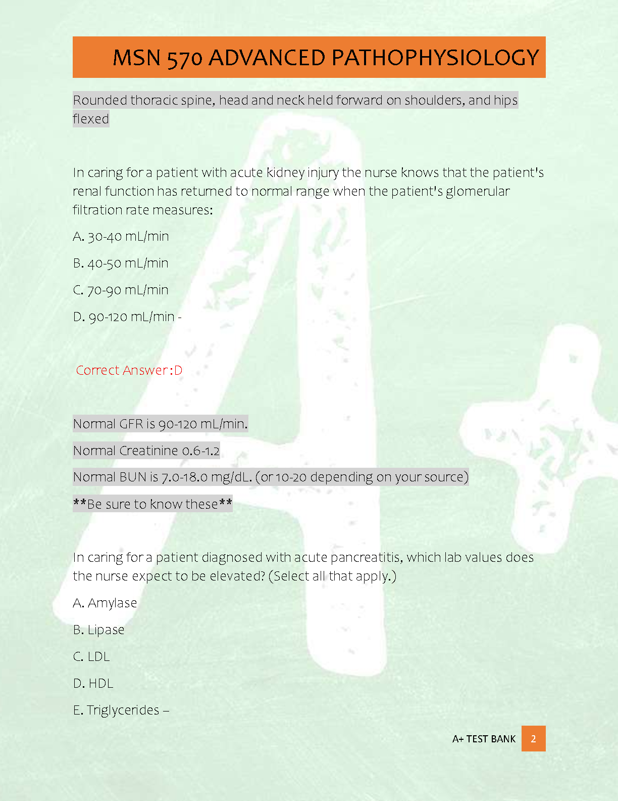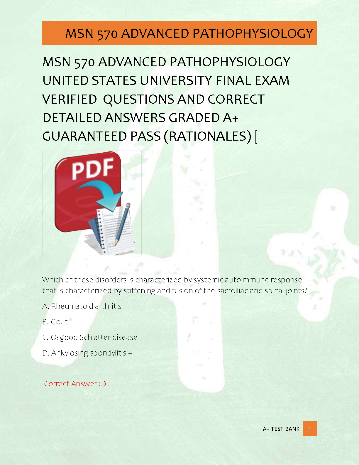 Unlock your potential and secure an A+ on your MSN 570 Advanced Pathophysiology final exam at United States University with this comprehensive test bank. This invaluable resource features a collection of verified exam questions, each paired with detailed, correct answers and in-depth rationales. Designed to mirror the actual final exam, our test bank helps you master complex pathophysiological concepts, identify key areas of study, and build the confidence you need to succeed. This guide is your key to not just passing, but excelling in your course.