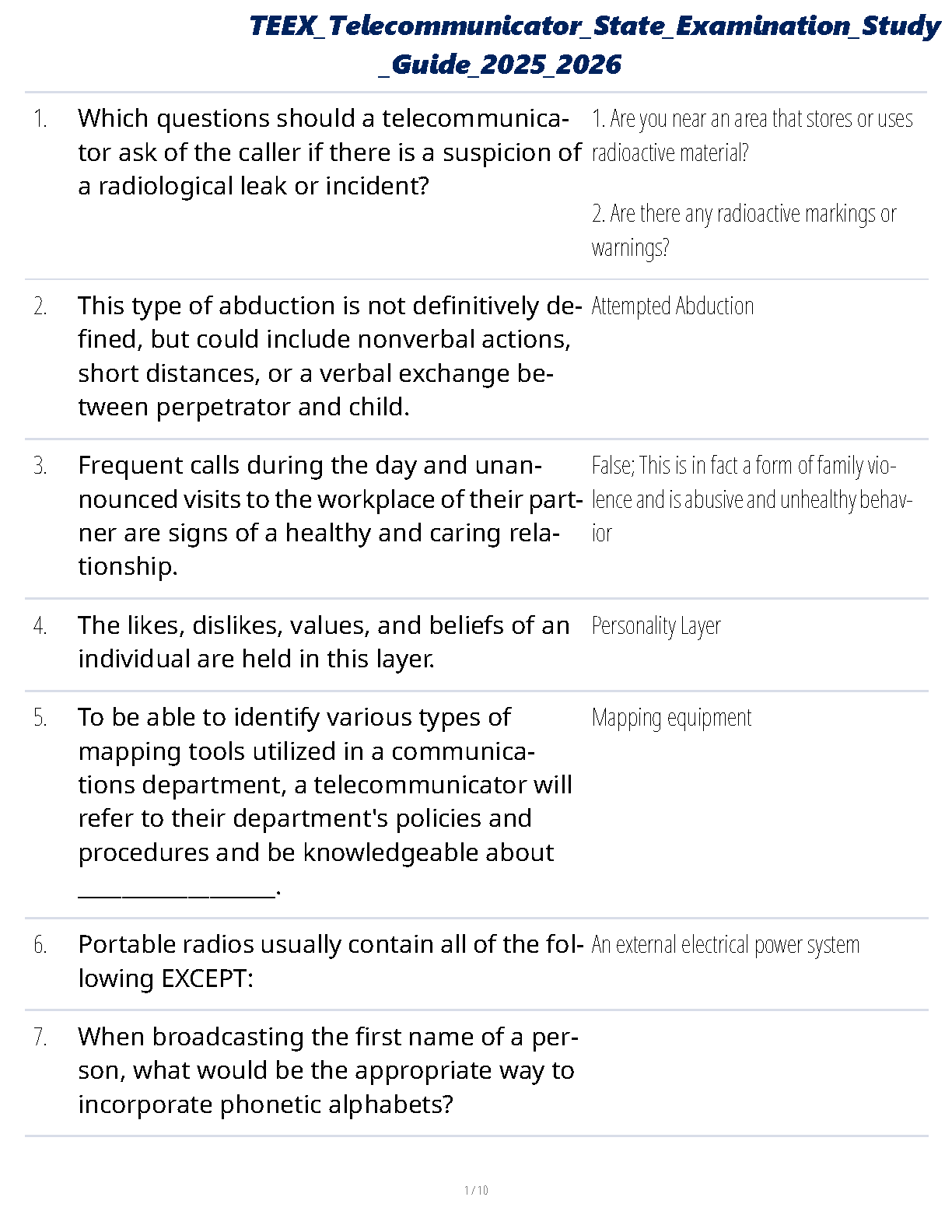 Prepare to excel in your TEEX Telecommunicator State Examination with our newly updated 2025-2026 study guide. This comprehensive resource is packed with essential questions and detailed answers covering all critical topics you'll face on the test, from handling radiological incidents and abduction scenarios to understanding mapping equipment and proper radio protocol. This guide is specifically designed to give you the confidence and knowledge needed to pass your certification on the very first try, eliminating the stress of resits. Get your copy now and take the first step towards a successful career as a certified telecommunicator.