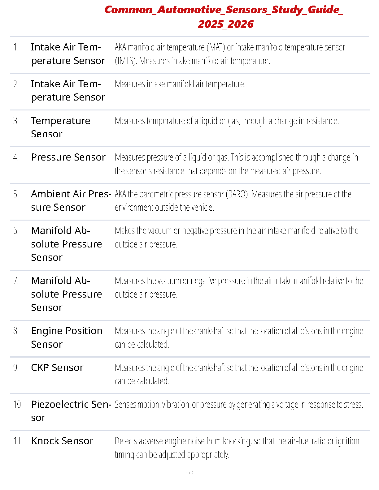 Unlock your potential and ace your automotive exams with our newly released 2025-2026 study guide on common automotive sensors. This guide provides clear, easy-to-understand explanations for crucial components like the Intake Air Temperature (IAT), Manifold Absolute Pressure (MAP), Engine Position (CKP), and Knock Sensors. Designed to help you grasp complex concepts quickly, this resource is your key to passing on the first attempt and avoiding resits. Build a solid foundation in automotive diagnostics and excel in your studies.