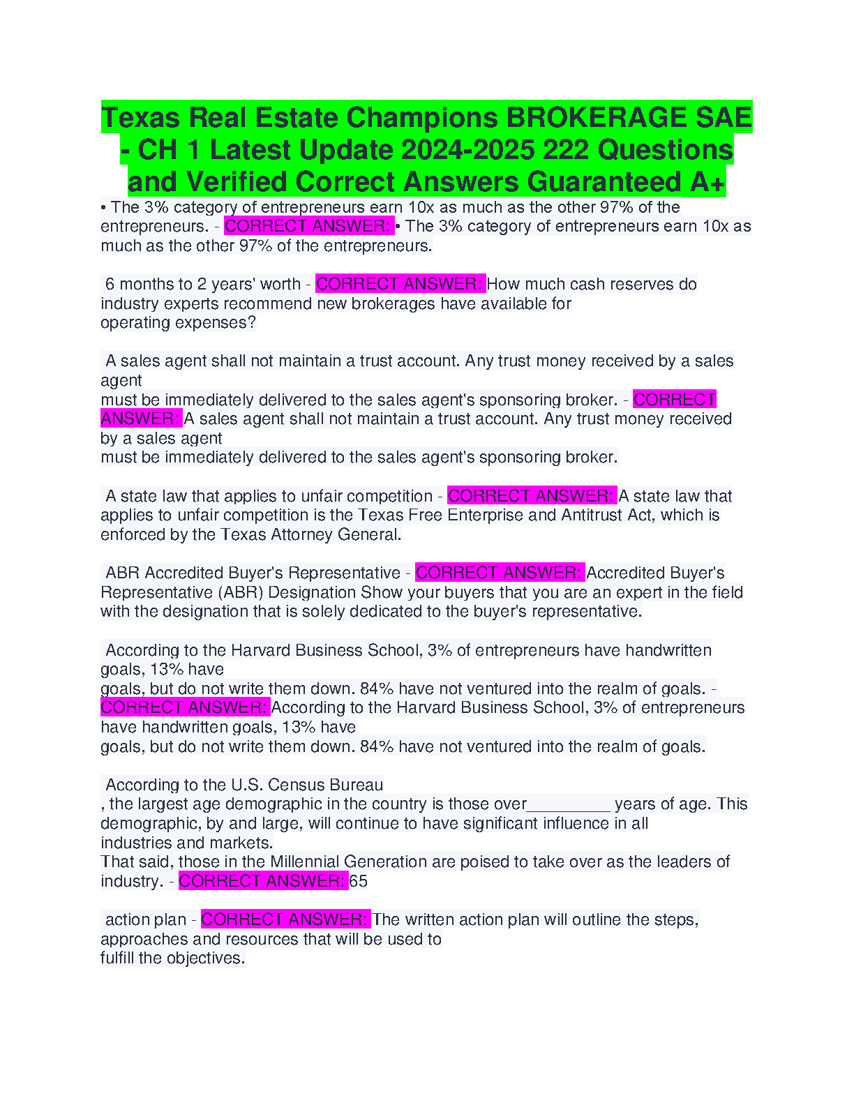 Unlock your potential and guarantee your success on the Texas Real Estate Brokerage SAE exam with this complete test bank for Chapter 1, based on the latest 2024-2025 curriculum from Champions School of Real Estate. This study guide features 222 meticulously verified questions and answers, designed to help you master the core concepts and pass with flying colors on your first try. Stop worrying about resits and start building the confidence you need to become a successful Texas real estate broker. Get your A+ guaranteed!