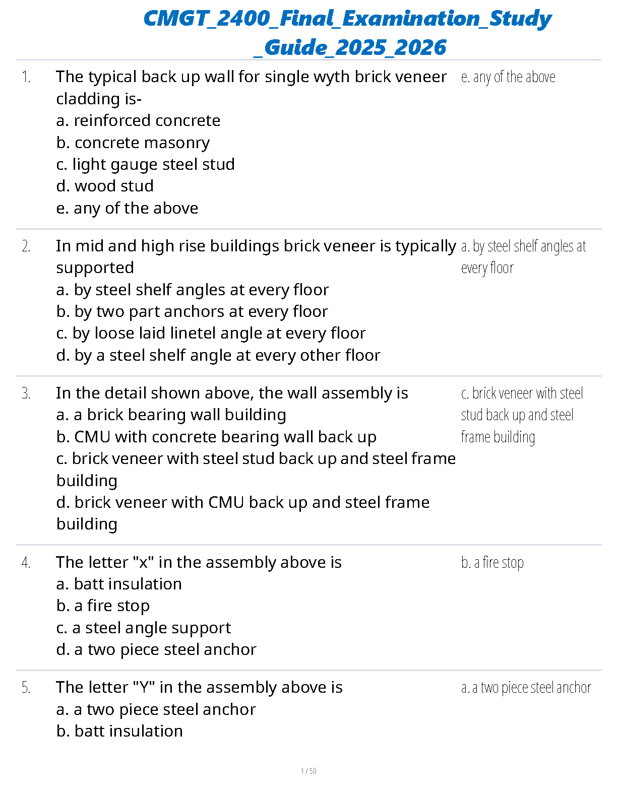 Master the final exam for CMGT 2400 with our comprehensive Test Bank for the 2025-2026 academic year. This essential study resource is expertly crafted to align with 'Fundamentals of Building Construction: Materials and Methods, 7th Edition' by Allen and Iano. Inside, you'll find an extensive collection of multiple-choice questions complete with verified answers, covering critical topics such as single wyth brick veneer, high-rise building supports, wall assemblies, steel stud framing, fire stops, and more. This study guide is your ultimate tool to understand complex concepts, practice with real exam-style questions, and walk into your final exam with confidence. Secure the grade you deserve and pass on your first attempt!