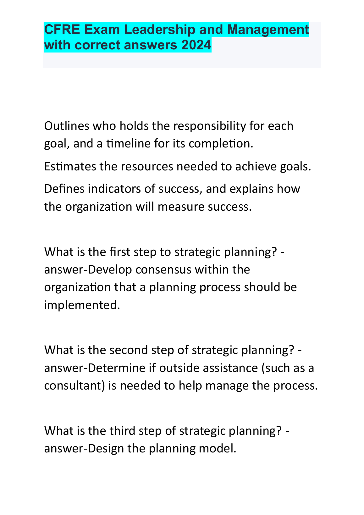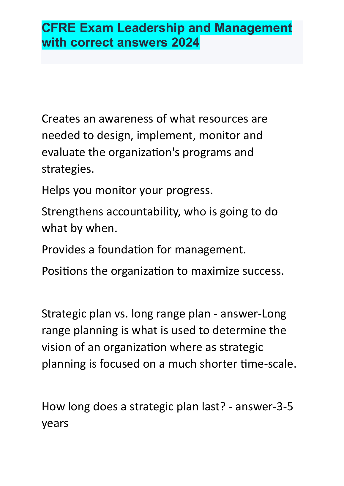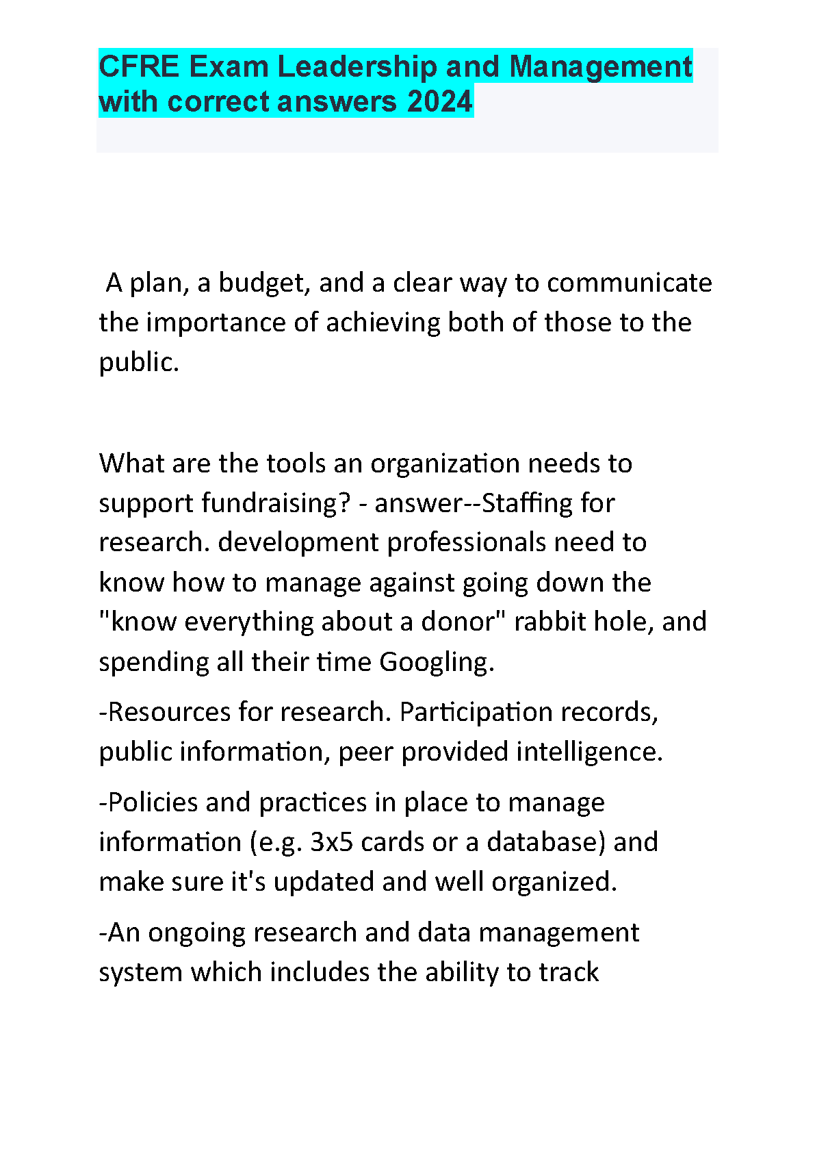 Unlock your potential and ace the Certified Fund Raising Executive (CFRE) exam with our newly updated Leadership and Management Test Bank for the 2025/2026 academic year. This comprehensive guide is specifically designed to help you master the key concepts, featuring a wide array of exam-style questions with detailed, correct answers. Dive into critical topics like mission statement development, creating a culture of philanthropy, and strategic organizational direction. Prepare effectively, build your confidence, and ensure you pass on your first attempt, avoiding costly resits. Get the essential resource for every aspiring CFRE professional!