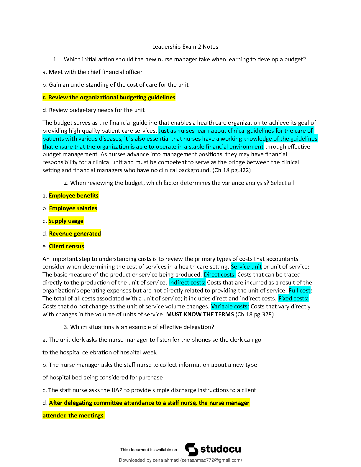 Unlock success in your nursing leadership course with our comprehensive Exam 2 Elaborations for the 2025/2026 academic year. This essential study resource provides in-depth answers and rationales for critical management topics, including developing a budget, understanding cost structures (direct, indirect, fixed, variable costs), and mastering effective delegation. Aligned with core concepts from Marquis and Huston's renowned text, this guide is expertly designed to help you ace your exam, eliminate the stress of resits, and excel in your role as a future nurse manager.