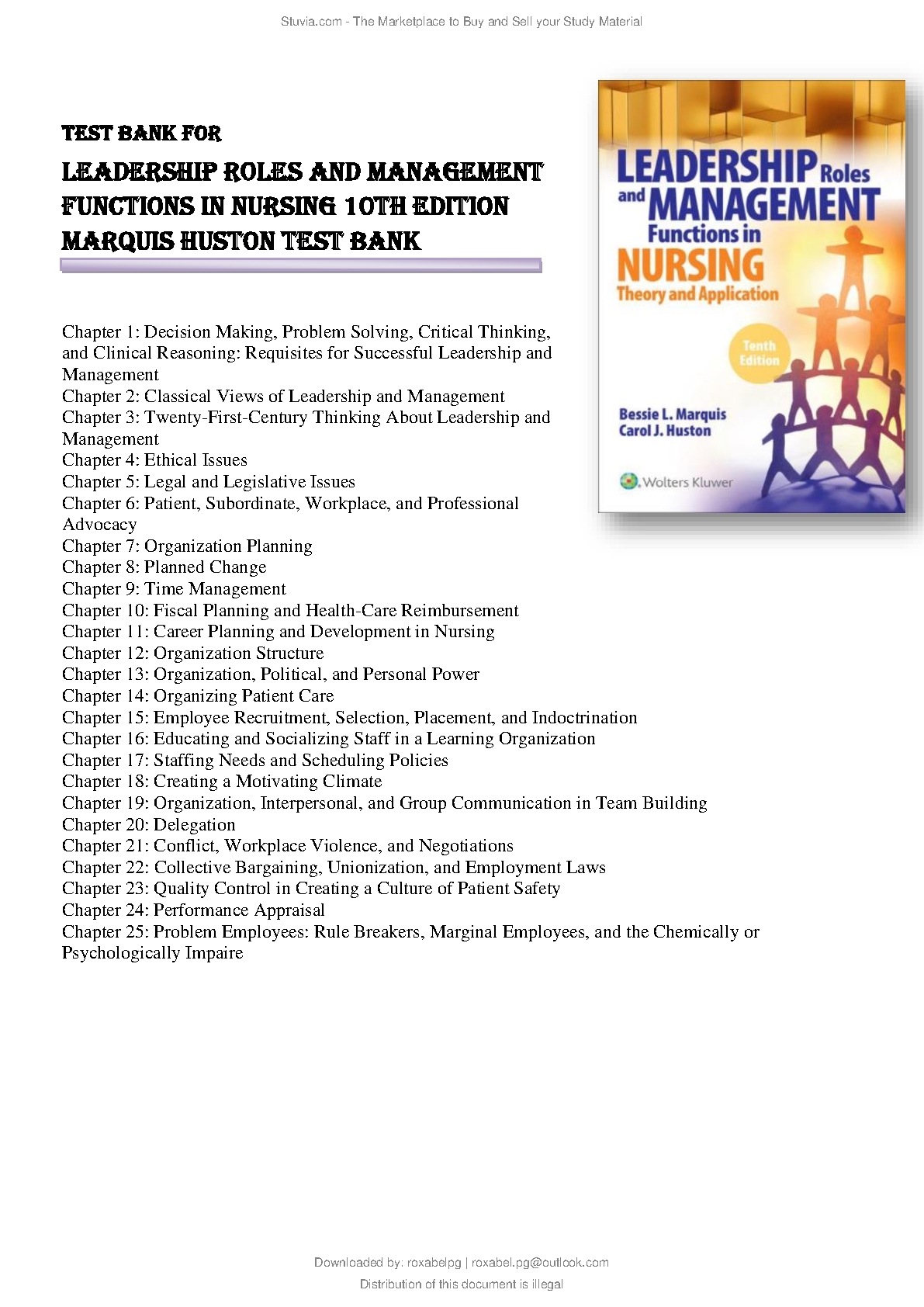 Test Bank for Leadership Roles and Management Functions in Nursing, 10th Edition by Bessie L. Marquis & Carol J. Huston