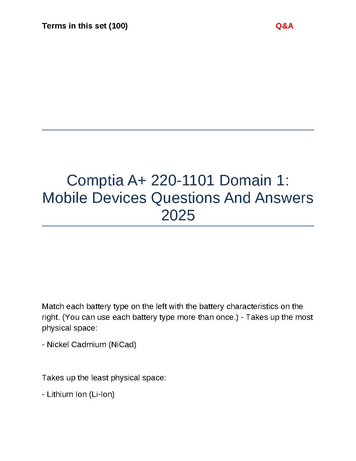 CompTIA A+ Core 1 (220-1101) Test Bank: Domain 1 Mobile Devices Latest 2025/2026 Questions & Answers