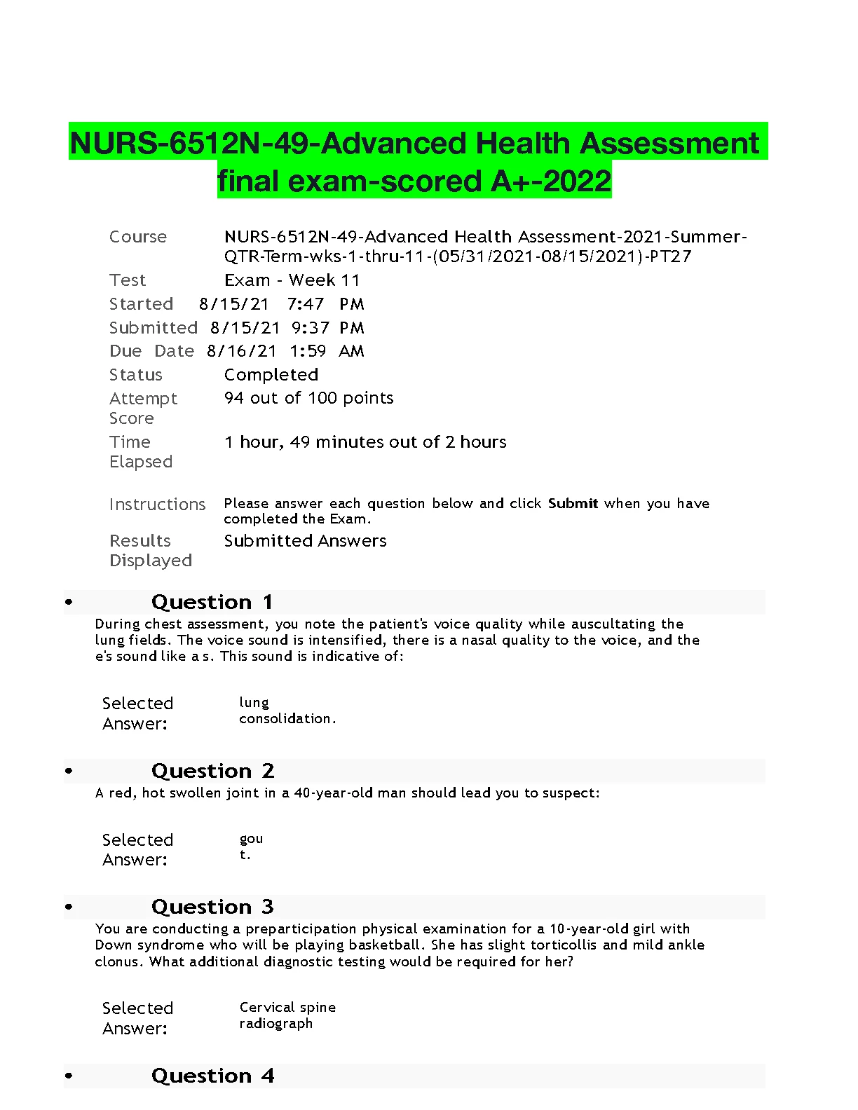 NURS 6512N 49 Advanced Health Assessment Final Exam. RATED A+