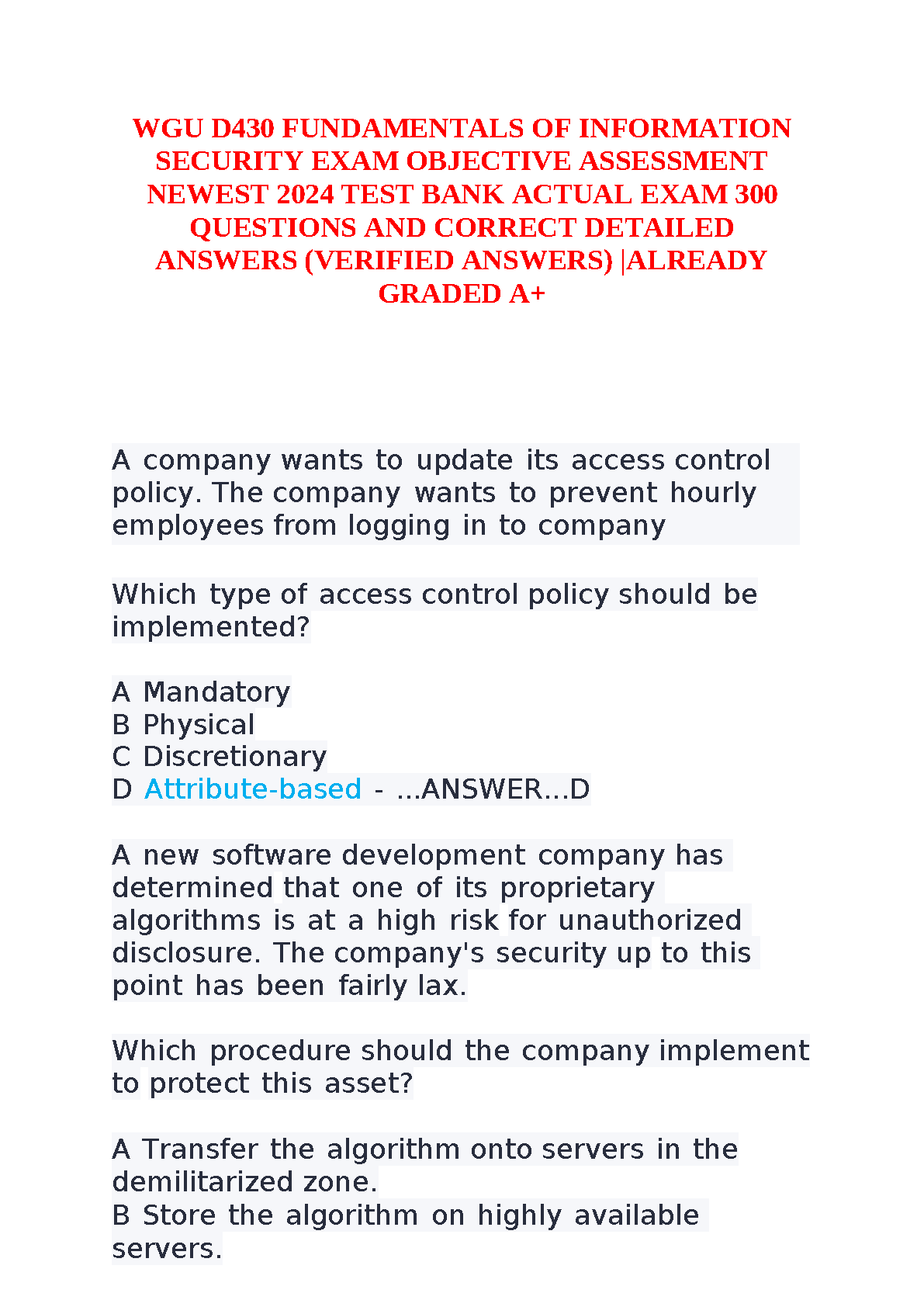 Excel in your WGU D430 Fundamentals of Information Security objective assessment with this comprehensive 2024 test bank. This essential study guide features 300 up-to-date, actual exam questions, complete with detailed and verified answers. Designed to ensure you grasp all critical concepts, this resource is proven to help students achieve an A+ grade. Prepare effectively, build confidence, and pass your certification on the first attempt.