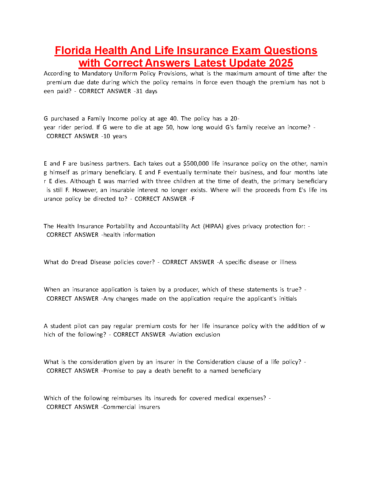 Unlock your potential and secure your Florida 2-15 Health & Life Insurance license with our latest 2025/2026 test bank. This comprehensive resource is packed with a wide range of exam-style questions, each complete with a verified correct answer, covering key concepts like Mandatory Uniform Policy Provisions, HIPAA, policy riders, and insurable interest. Designed to mirror the actual exam, this study guide is your ultimate tool to pass on your first attempt, saving you the time and stress of a resit. Get the confidence you need to succeed!
