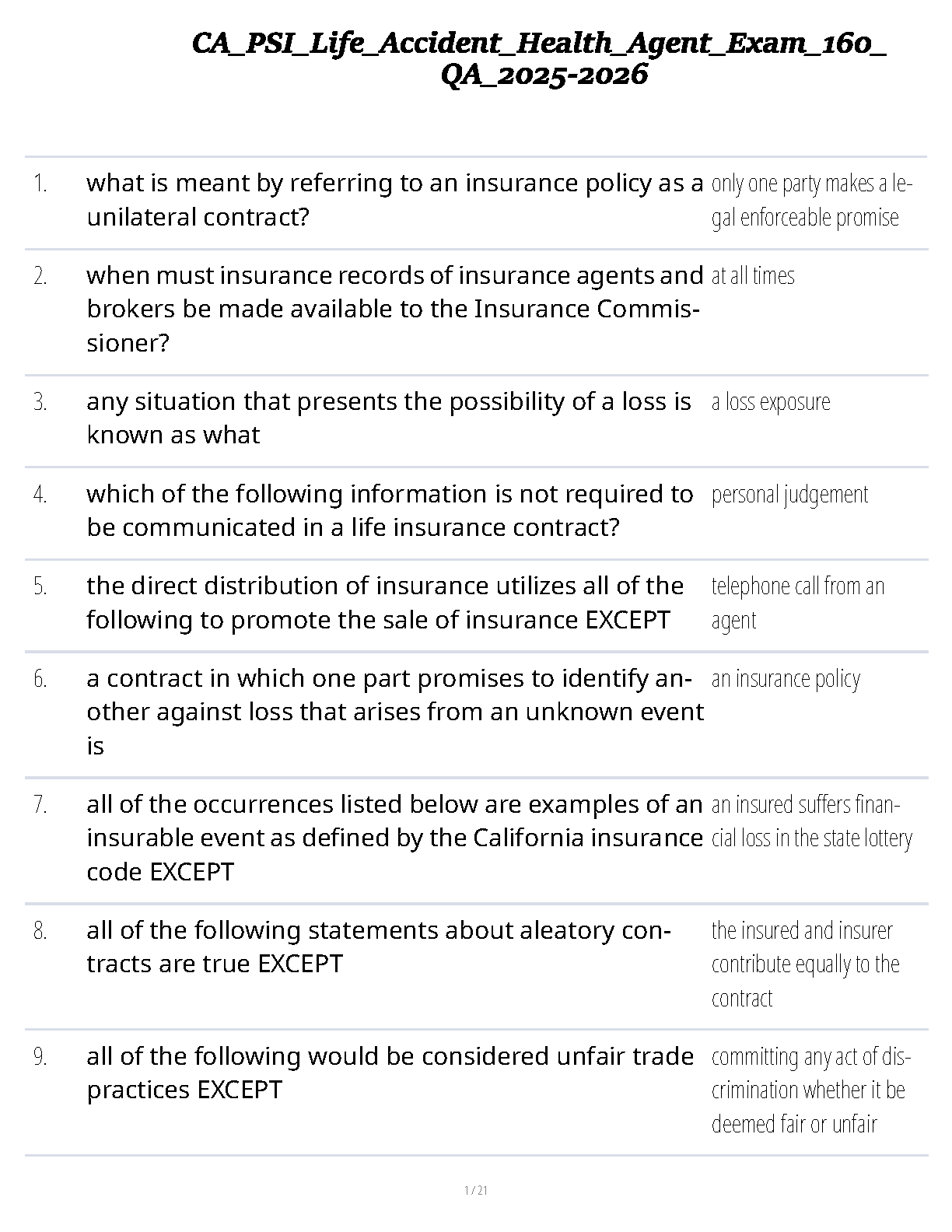 CA PSI Life, Accident & Health Agent Exam Test Bank 2025-2026 | 160 Questions and Answers for First-Time Pass