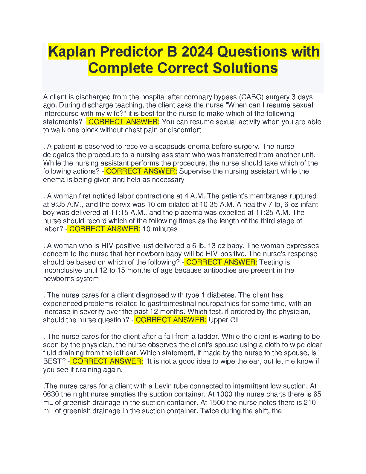 Get ready to ace your nursing exams with the complete 2024 Test Bank for the Kaplan Predictor B. This comprehensive study guide features a vast collection of exam-style questions, each paired with a verified, correct solution. Covering all essential nursing topics from post-operative care to delegation and obstetrics, this resource is meticulously designed to help you understand key concepts, practice critical thinking, and walk into your exam with confidence. It's the ultimate tool to ensure you pass on your first attempt and excel in your nursing program.