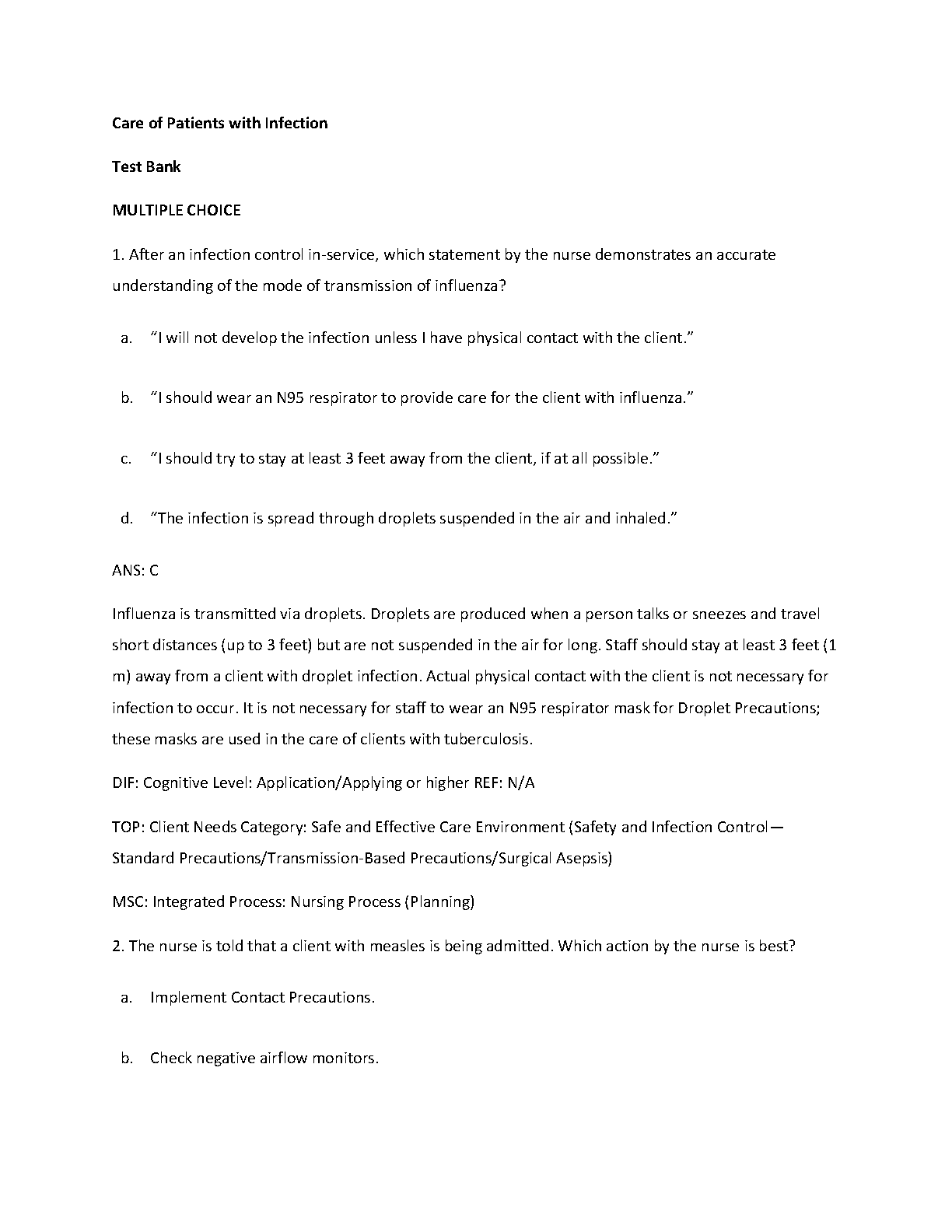 Master your Med-Surg course with the official Test Bank for the 11th Edition of 'Medical-Surgical Nursing' by Ignatavicius, Workman, and Rebar. This comprehensive resource focuses on the crucial chapter 'Care of Patients with Infection,' providing an extensive collection of NCLEX-style multiple-choice questions. Each question is accompanied by the correct answer and a detailed rationale, clarifying key concepts such as modes of transmission, standard and transmission-based precautions, and specific nursing interventions for infectious diseases like influenza. This test bank is an invaluable study tool for nursing students aiming to deepen their understanding, improve critical thinking skills, and confidently pass their exams.