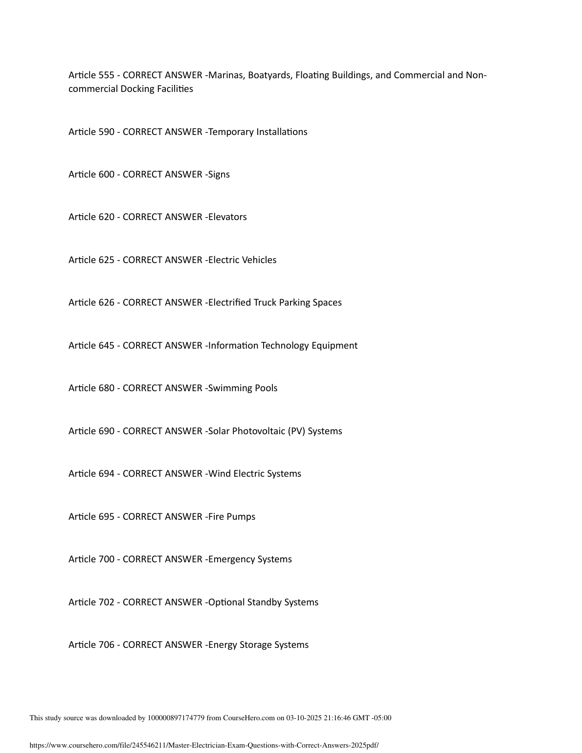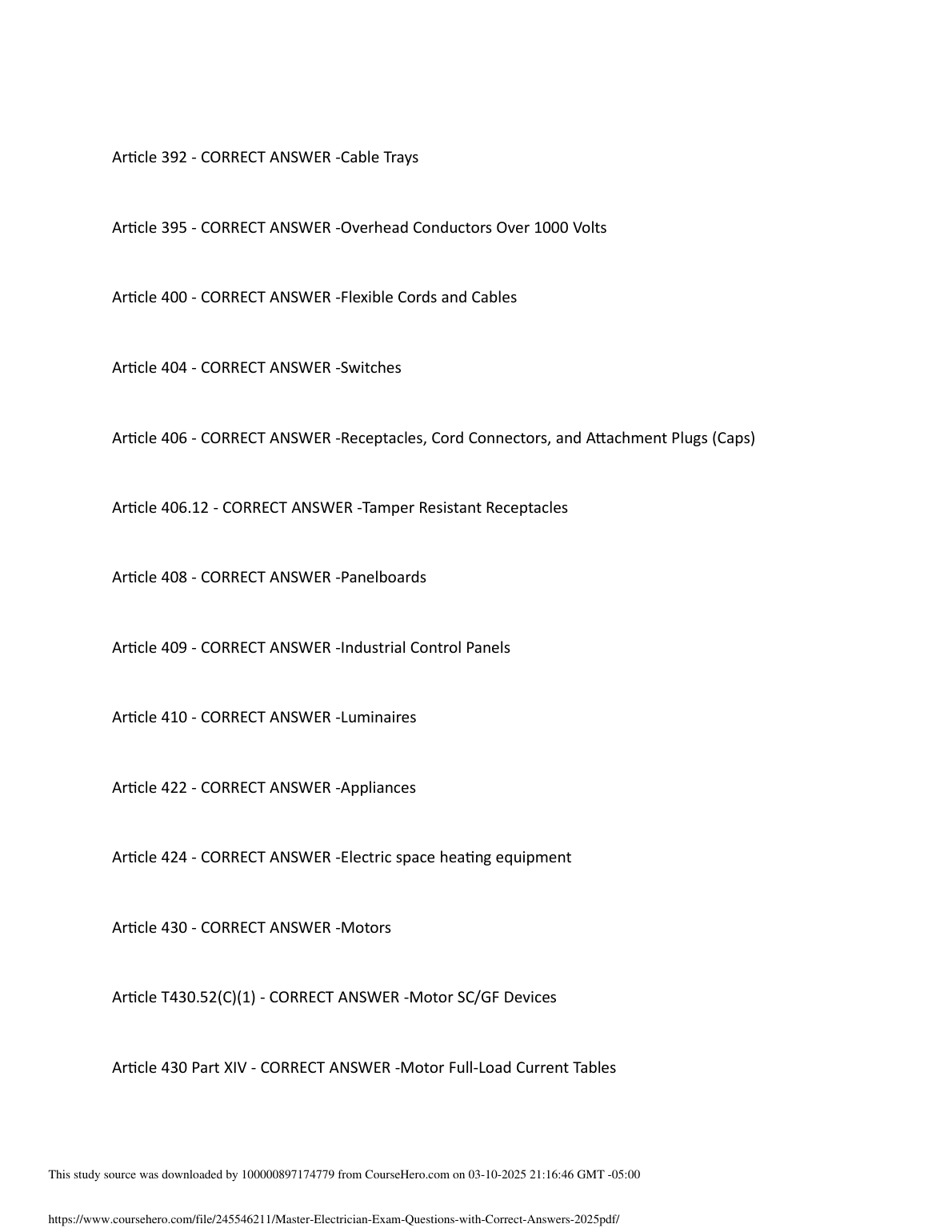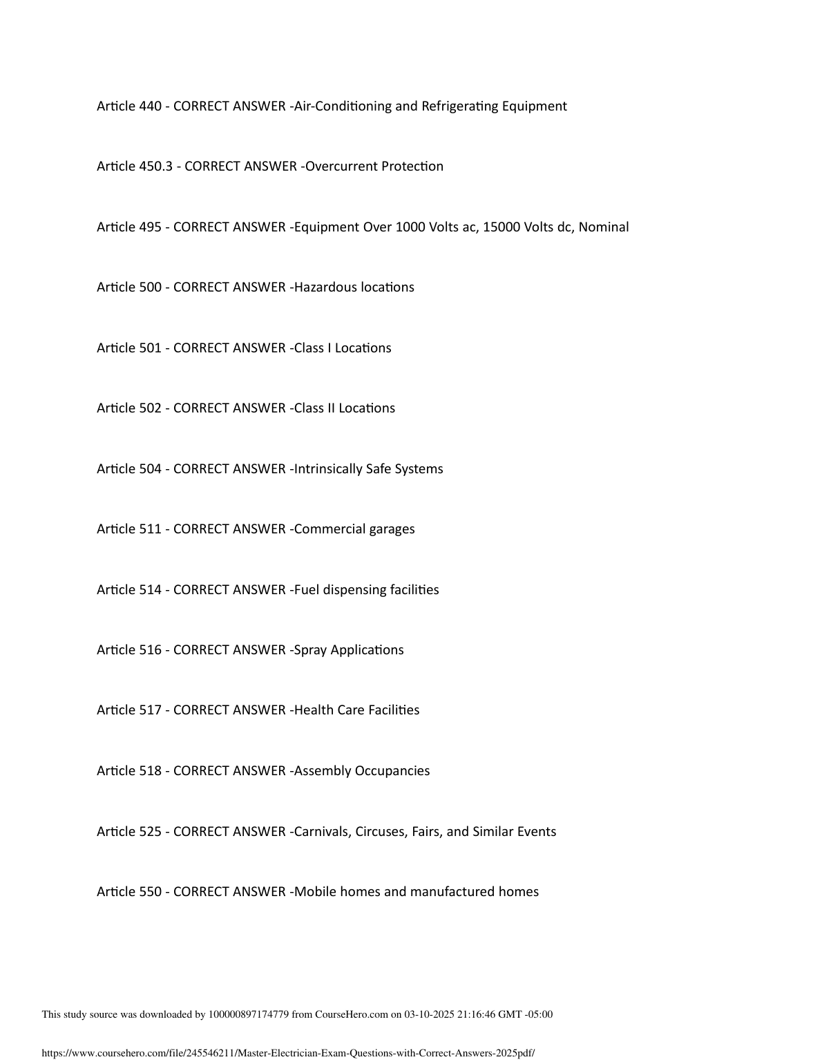 Prepare to ace your Master Electrician certification exam with our comprehensive 2025 Test Bank. This essential study resource provides a detailed collection of exam-style questions paired with 100% correct and verified answers. Covering crucial topics from the National Electrical Code (NEC) such as Branch Circuits, Feeders, Calculations, GFCI/AFCI Protection, and more. This guide is expertly designed to help you master the material, build confidence, and pass your exam on the very first try. Get the latest updated content for the 2025/2026 academic year and secure your certification without resits.