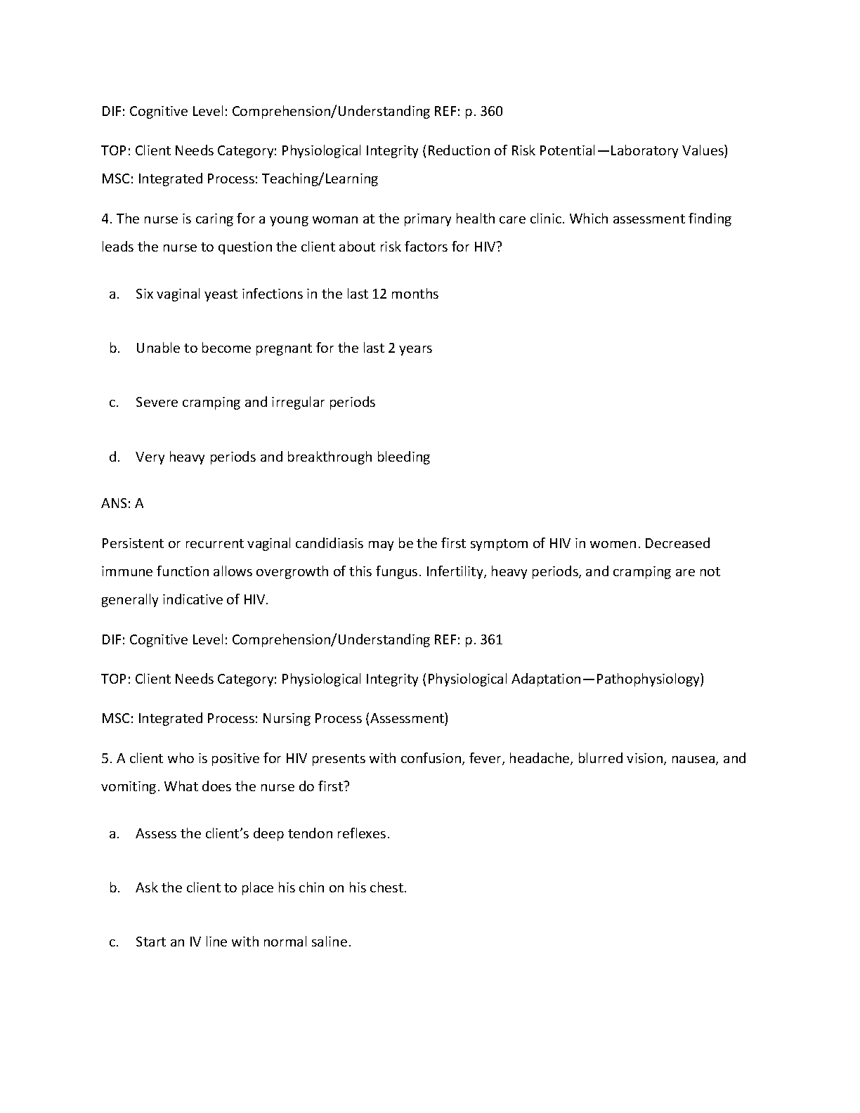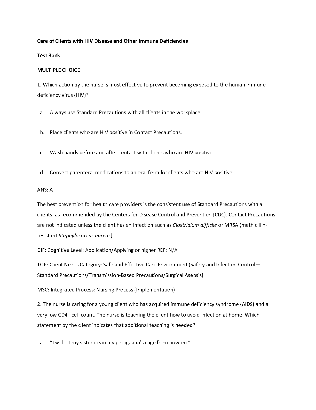 Excel in your medical-surgical nursing course with this complete test bank for the chapter on 'Care of Clients with HIV Disease and Other Immune Deficiencies' from Ignatavicius, Workman, and Rebar's Medical-Surgical Nursing, 10th Edition. This essential study tool provides a wide range of multiple-choice questions, each accompanied by a correct answer and a detailed rationale to clarify complex concepts. Deepen your understanding of infection control, standard precautions, patient safety, and critical nursing interventions for immunocompromised clients. This resource is perfect for preparing for exams, homework assignments, and building a strong foundation for your NCLEX success.