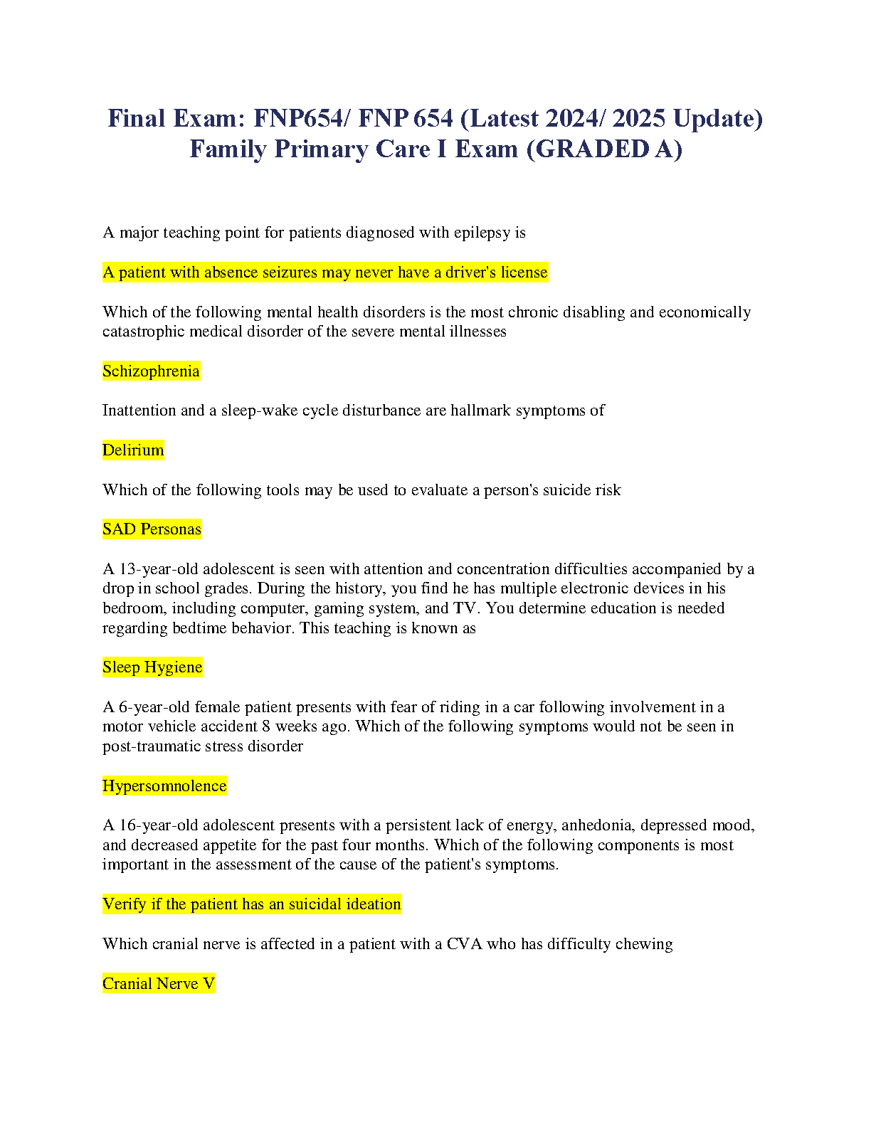 Ready to excel in your FNP 654 Family Primary Care I final exam? Our latest 2024/2025 test bank is your key to success. This comprehensive resource is packed with verified questions and detailed, A-graded answers, covering all essential topics from mental health and neurology to patient teaching and sleep hygiene. Study smarter, not harder, and gain the confidence to pass your exam on the very first attempt. Secure your A and avoid the stress of resits with this ultimate study guide.