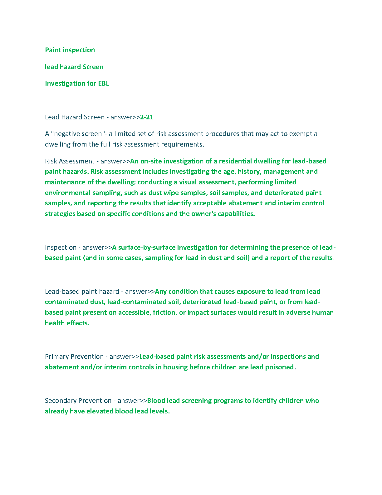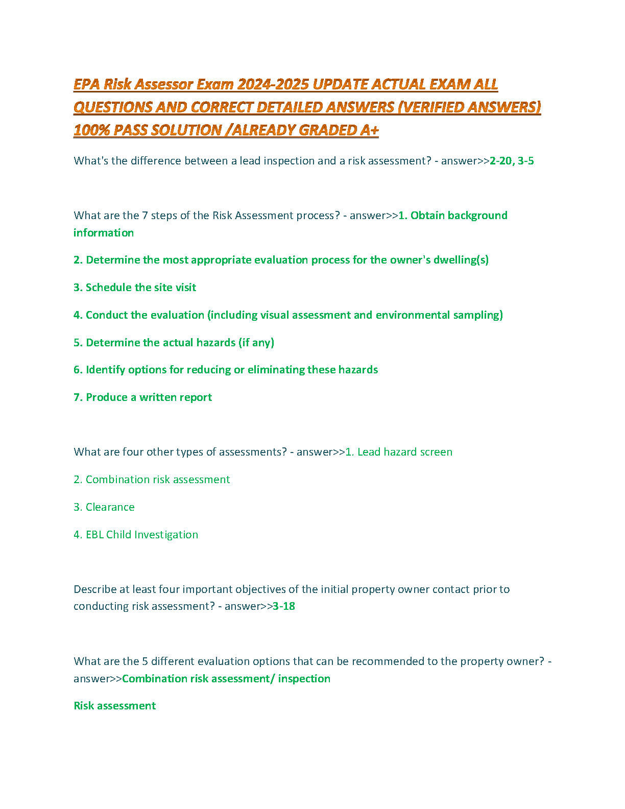 Prepare to ace your EPA Risk Assessor certification with our ultimate 2025/2026 study guide. This comprehensive resource features a complete set of actual exam questions paired with detailed, verified answers, all graded A+ to ensure accuracy. Master crucial topics including the 7 steps of the risk assessment process, the distinction between lead inspections and risk assessments, and other essential evaluation types. This guide is meticulously designed to help you pass the EPA Risk Assessor exam on your very first attempt, saving you from costly and time-consuming resits. Get the confidence you need to succeed with this 100% pass solution.
