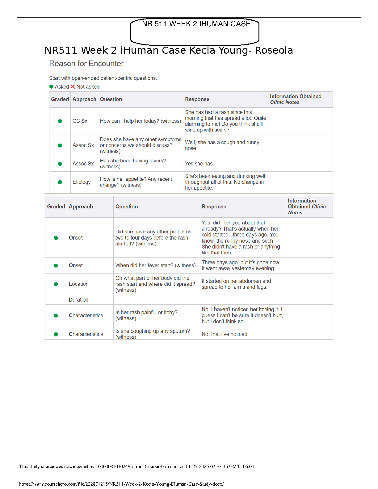 Unlock an A+ on your NR 511 Week 2 assignment with this detailed iHuman case study on Kecia Young, focusing on the diagnosis of Roseola. This 2025/2026 guide provides a complete walkthrough of the patient encounter, including the essential questions to ask for Chief Complaint (CC), Associated Symptoms (Assoc Sx), Onset, Location, and more. Master the key steps to obtain crucial clinical information and ensure you pass your evaluation on the first attempt, avoiding any resits. This resource is your key to success in the NR 511 iHuman simulation.