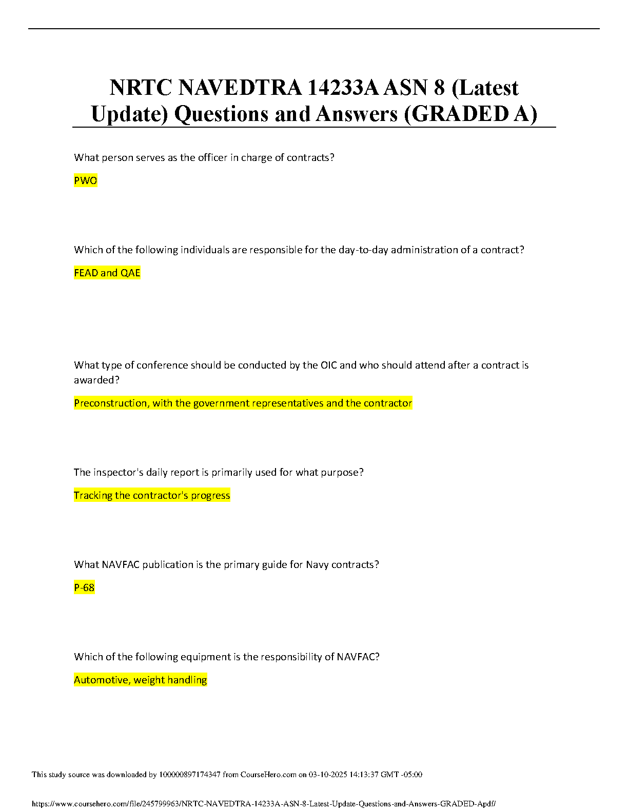 Unlock your A-grade potential with the latest, verified test bank for Assignment 8 of NAVEDTRA 14233A, Seabee Combat Handbook, Volume 1. This comprehensive resource provides a full set of questions and expertly verified answers, ensuring you grasp key concepts for your exam. Dive deep into topics like contract management, the roles of PWO, FEAD, and QAE, preconstruction procedures, and essential NAVFAC publications. Stop struggling and start succeeding—download this study guide today to ace your NRTC assignment and advance your career!