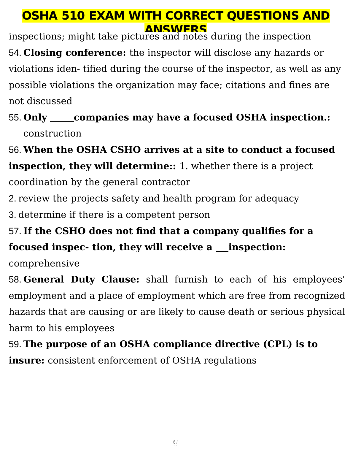 Elevate your preparation and guarantee your success on the OSHA 510 certification exam with our premier test bank for the 2025/2026 academic year. This comprehensive study resource features a meticulously compiled set of real exam questions, complete with 100% correct and verified answers. Dive deep into crucial topics such as OSHA's mission, the 'Focus Four' hazards, inspection priorities, and citation types. Designed to help you master the material efficiently, our OSHA 510 test bank is the ultimate tool to pass your exam on the first attempt, saving you time and avoiding costly resits. Download now and gain the confidence to excel!