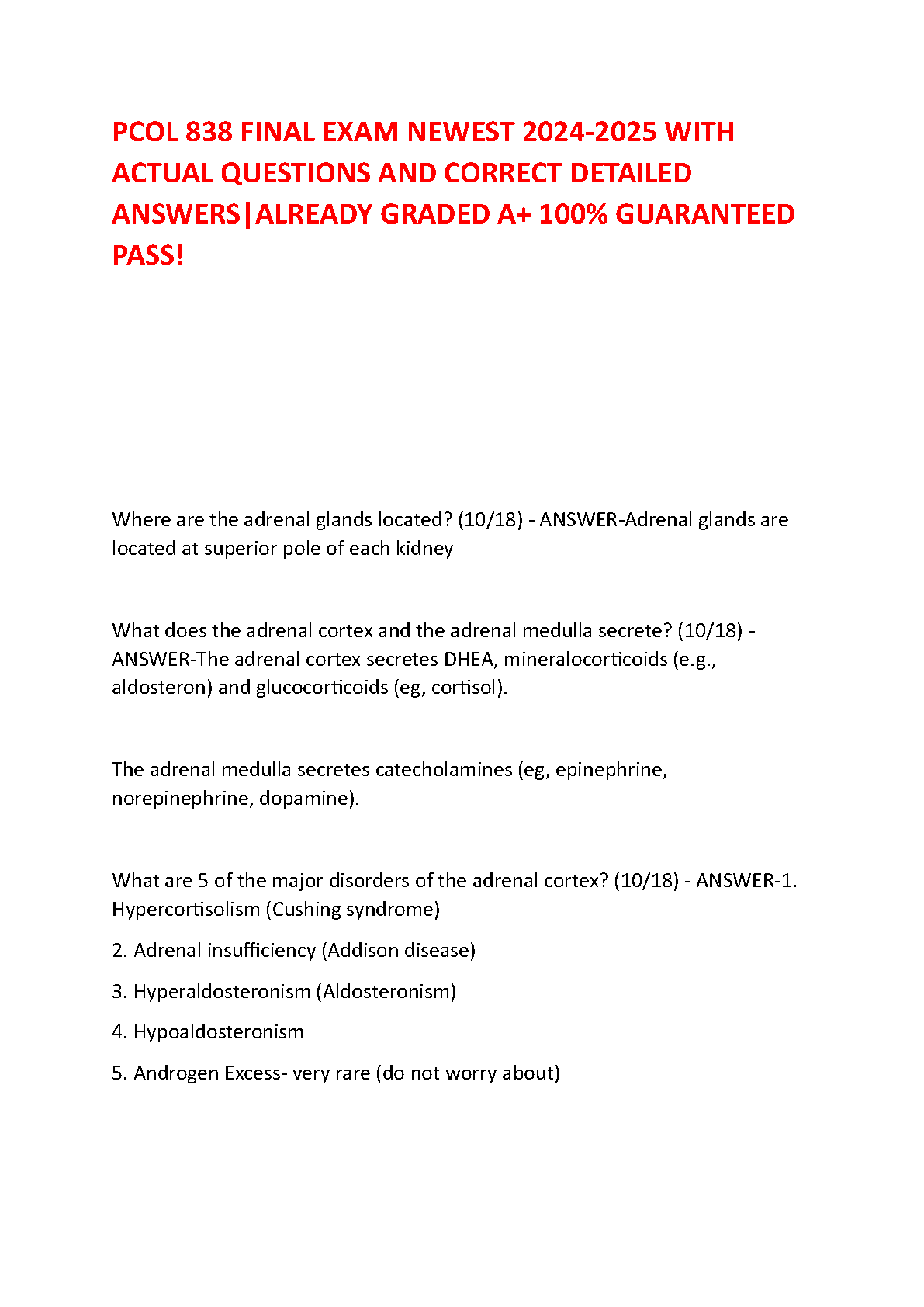 Ace your PCOL 838 final exam with our newly updated 2024-2025 study guide. This comprehensive resource features a collection of actual exam questions paired with detailed, correct answers, all verified to help you achieve an A+ grade. Focus on key pharmacology topics, including the endocrine system, adrenal gland functions, and related disorders. Designed to ensure you pass on your first attempt and avoid resits, this guide is the ultimate tool for exam success. Download now and prepare to excel!