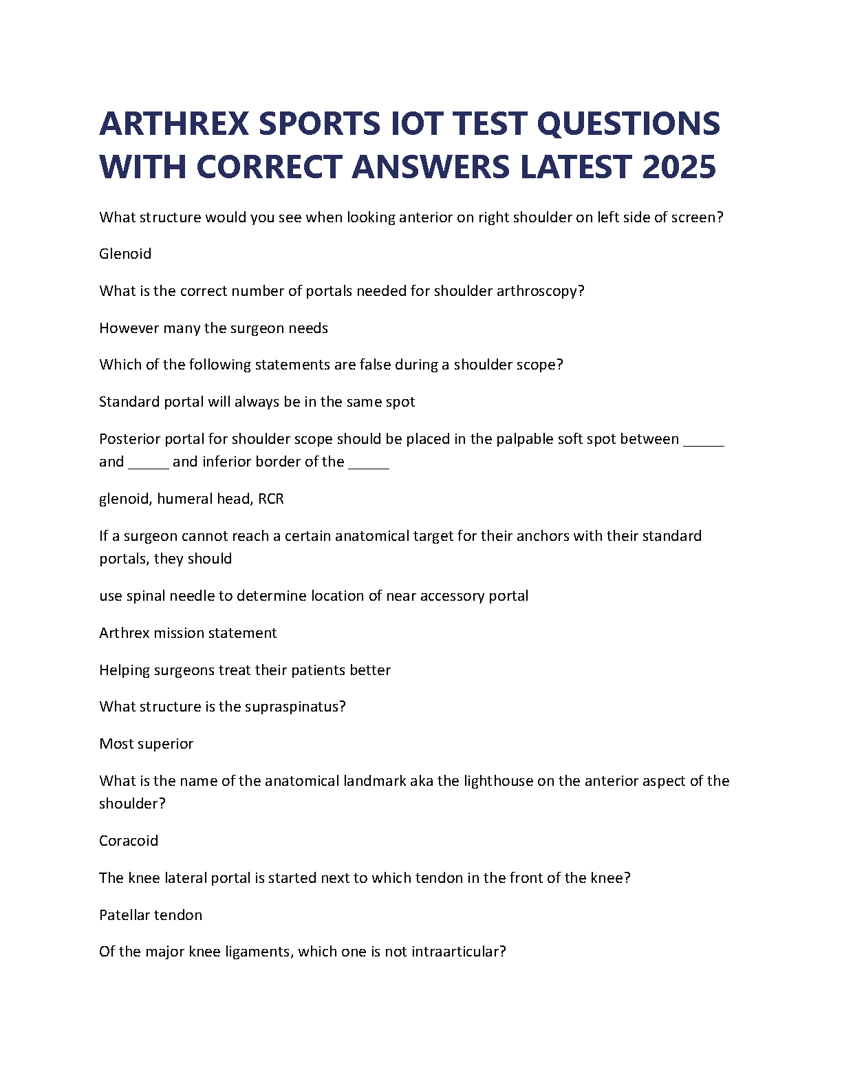Ace your Arthrex Sports Initial Orthopedic Training (IOT) with our meticulously compiled 2025 test bank. This essential study guide features a comprehensive collection of test questions directly from the exam, complete with 100% correct and verified answers. Covering crucial topics in sports medicine, including shoulder and knee arthroscopy, anatomical landmarks, and surgical portal placement, this resource is your key to mastering the material. Prepare confidently, understand the key concepts, and ensure you pass your certification on the first try. Download now to get instant access to the ultimate study tool for the Arthrex Sports IOT exam.