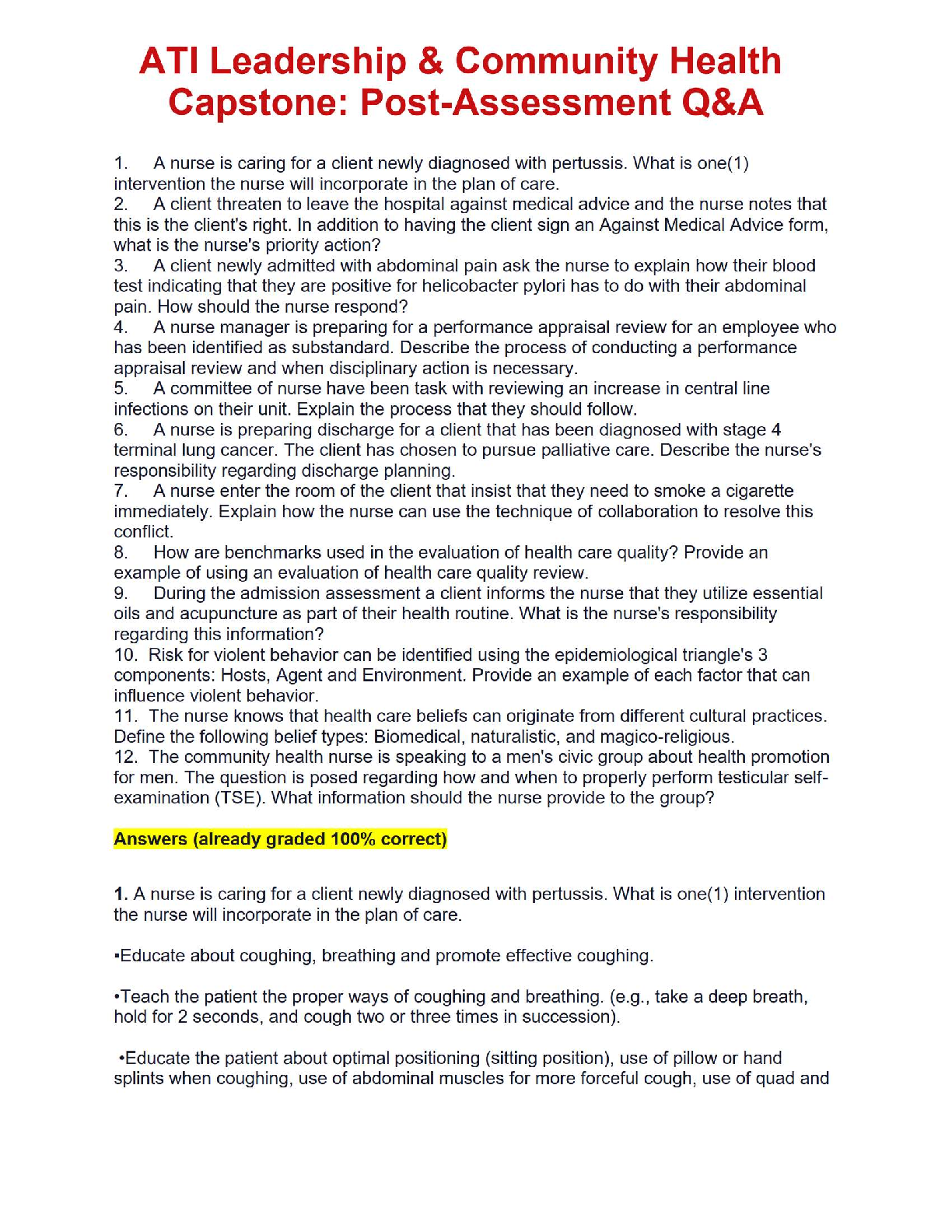 Ace your ATI Leadership & Community Health Capstone with this comprehensive post-assessment test bank. This essential study guide, developed by the experts at ATI Nursing Education, provides a complete set of questions and answers, all verified to be 100% correct. Master complex nursing scenarios covering everything from patient care for conditions like pertussis, handling patients leaving against medical advice, and understanding health beliefs, to critical leadership skills like performance reviews and conflict resolution. This resource is your ultimate tool for exam preparation, helping you to confidently pass your ATI Capstone assessment on your first try. Download now to get immediate access to the verified solutions you need to succeed!