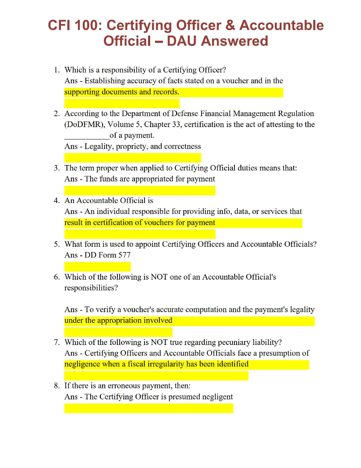 Unlock success in your Defense Acquisition University course with our complete Test Bank for CFI 100: Certifying Officer & Accountable Official. This up-to-date 2025/2026 resource provides verified questions and answers, covering all essential topics including officer responsibilities, the DoDFMR, pecuniary liability, and proper payment procedures. Designed to help you ace your exam on the first try, this study guide is your key to mastering the material and achieving certification without the stress of resits. Get instant access and start studying smart today!