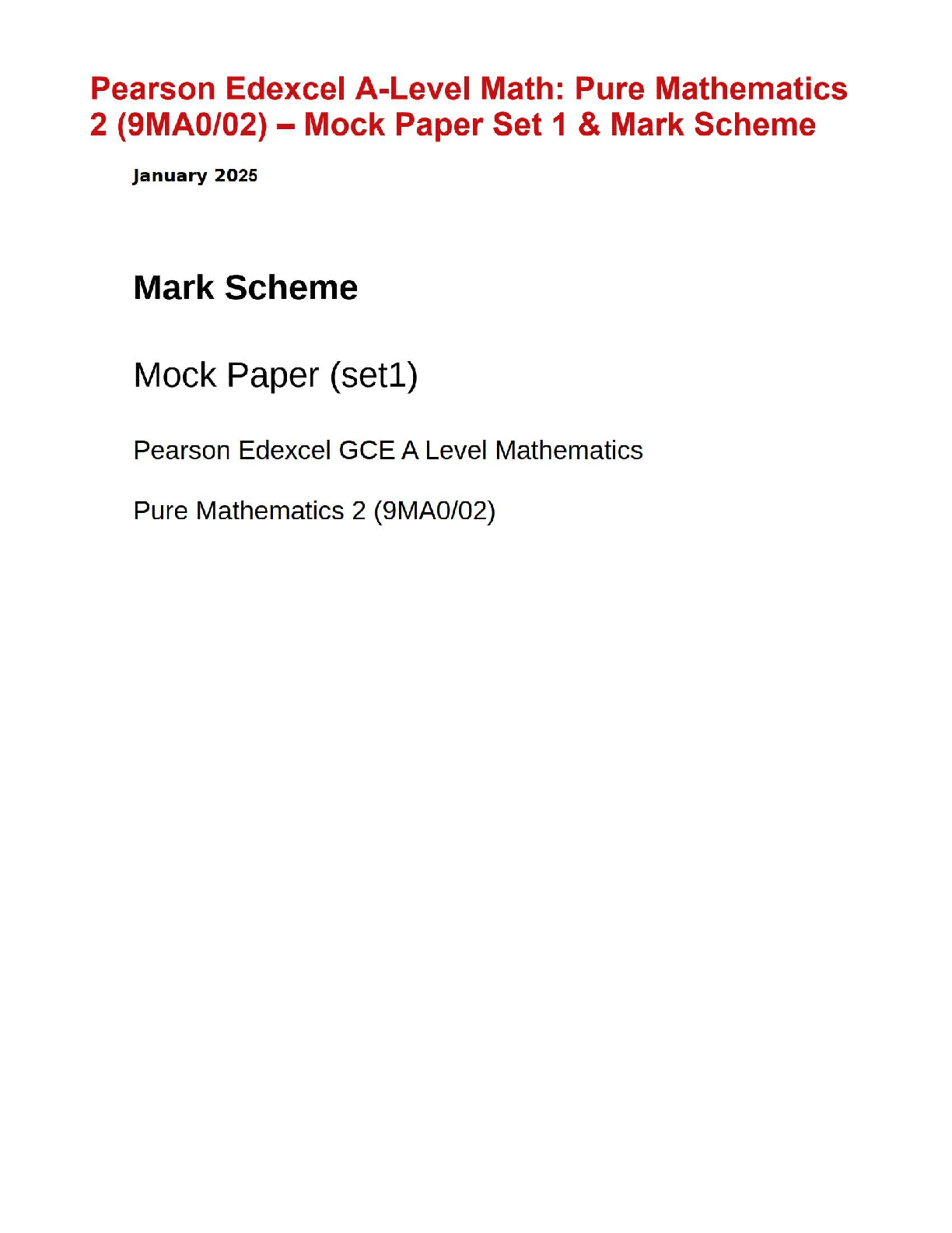 Edexcel A-Level Maths: Pure Mathematics 2 (9MA0/02) Mock Paper Set 1 & Mark Scheme | Latest 2025/2026 Edition for Exam Success