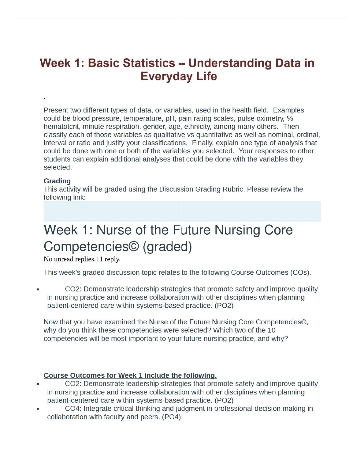 Unlock success in your nursing program with our latest 2025/2026 study guide for the Week 1 Graded Discussion. This comprehensive resource provides the exact prompts for two critical topics: 'Basic Statistics - Understanding Data in Everyday Life' and the 'Nurse of the Future Nursing Core Competencies.' Gain a crucial advantage by understanding how to classify health data, justify your reasoning, and critically analyze the core competencies essential for modern nursing. This guide is expertly designed to help you craft perfect responses, meet all course outcomes, and pass your assessments on the very first try, eliminating the stress of resits.