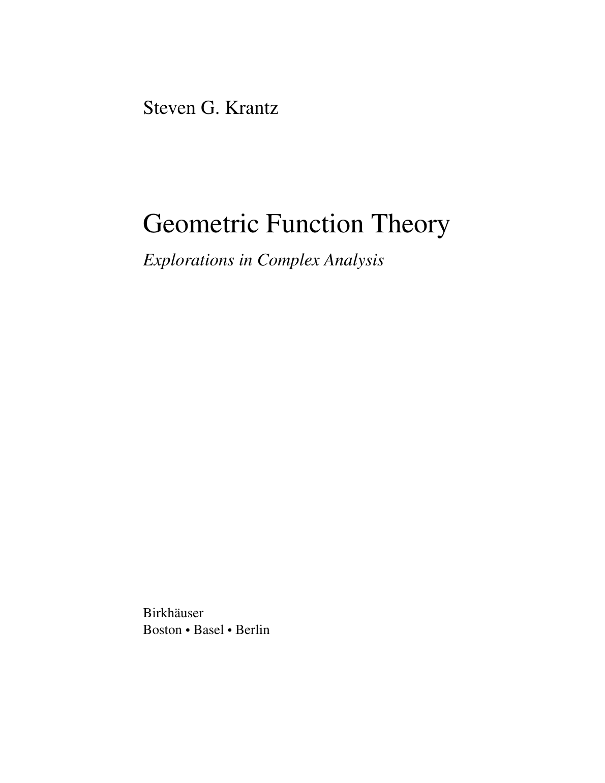 Unlock the secrets of Complex Analysis and ace your exams with our comprehensive study resource for 'Geometric Function Theory: Explorations in Complex Analysis' by Steven G. Krantz. This guide, fully updated for the 2025/2026 academic year, delves into the essential geometric aspects of function theory. Gain a deep understanding of core concepts such as conformal mappings, the Riemann mapping theorem, and univalent functions. Designed to be the ultimate companion for students, this resource provides clear explorations and insights to help you master challenging topics and pass your examinations on the first attempt, avoiding costly resits. Get the essential tool for success in your advanced mathematics course.