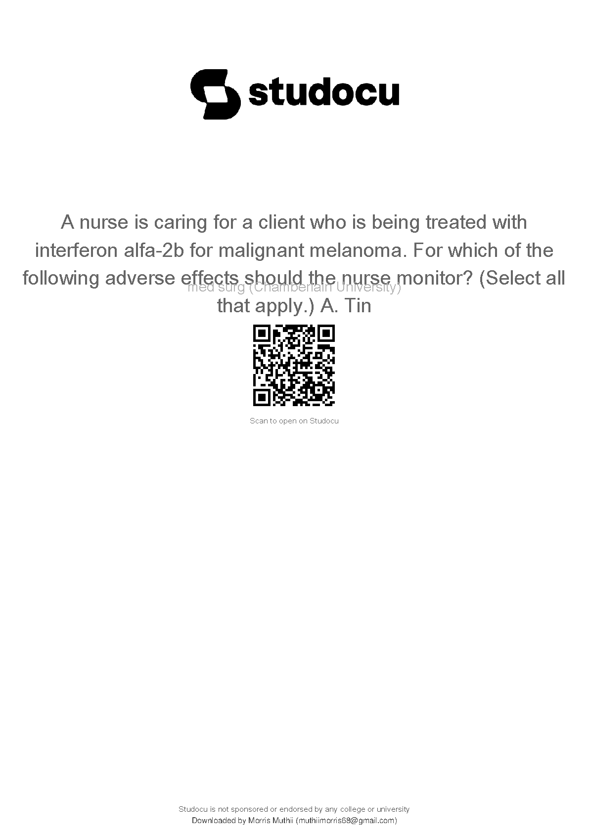 Unlock success in your nursing studies with our definitive Medical-Surgical & Pharmacology Test Bank, fully updated for the 2025/2026 academic year. This essential resource is packed with hundreds of practice questions, including challenging 'Select All That Apply' (SATA) formats, designed to mirror your actual exams. Dive deep into complex topics like the management of malignant melanoma with interferon alfa-2b and master the critical skill of monitoring for adverse effects. Each question comes with a detailed rationale to solidify your understanding. Prepare effectively, boost your confidence, and ensure you pass your exams on the very first attempt, leaving resits behind. Ideal for nursing students aiming for top grades and a comprehensive grasp of med-surg principles.