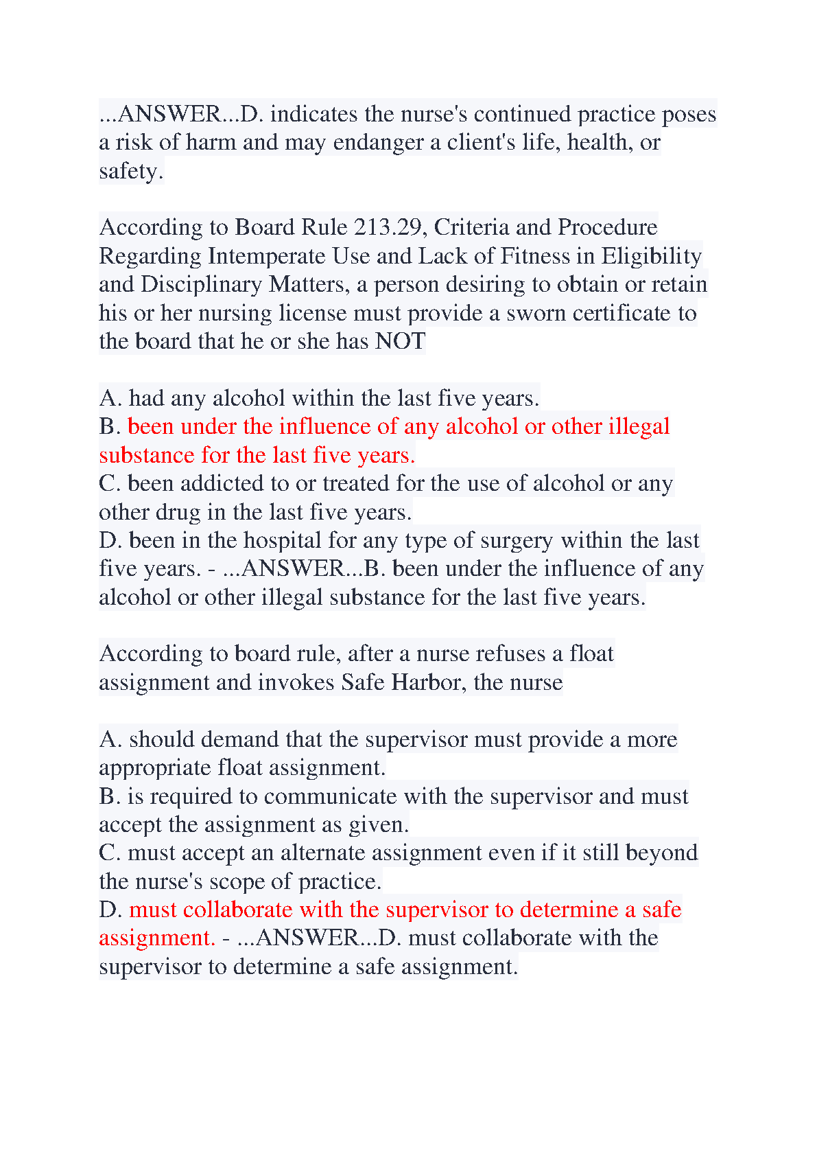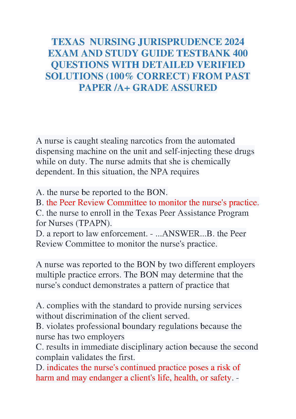 Ace your Texas Nursing Jurisprudence Exam (NJE) with our comprehensive 2024 Test Bank. This essential study resource features an extensive collection of 400 practice questions, each paired with detailed, verified solutions to ensure 100% accuracy. Designed to mirror the actual exam format and content, this guide covers all critical aspects of the Texas Nurse Practice Act (NPA). Master the material, build your confidence, and secure an A+ grade on your first try. This is the ultimate tool to help you pass the NJE efficiently and avoid resits.