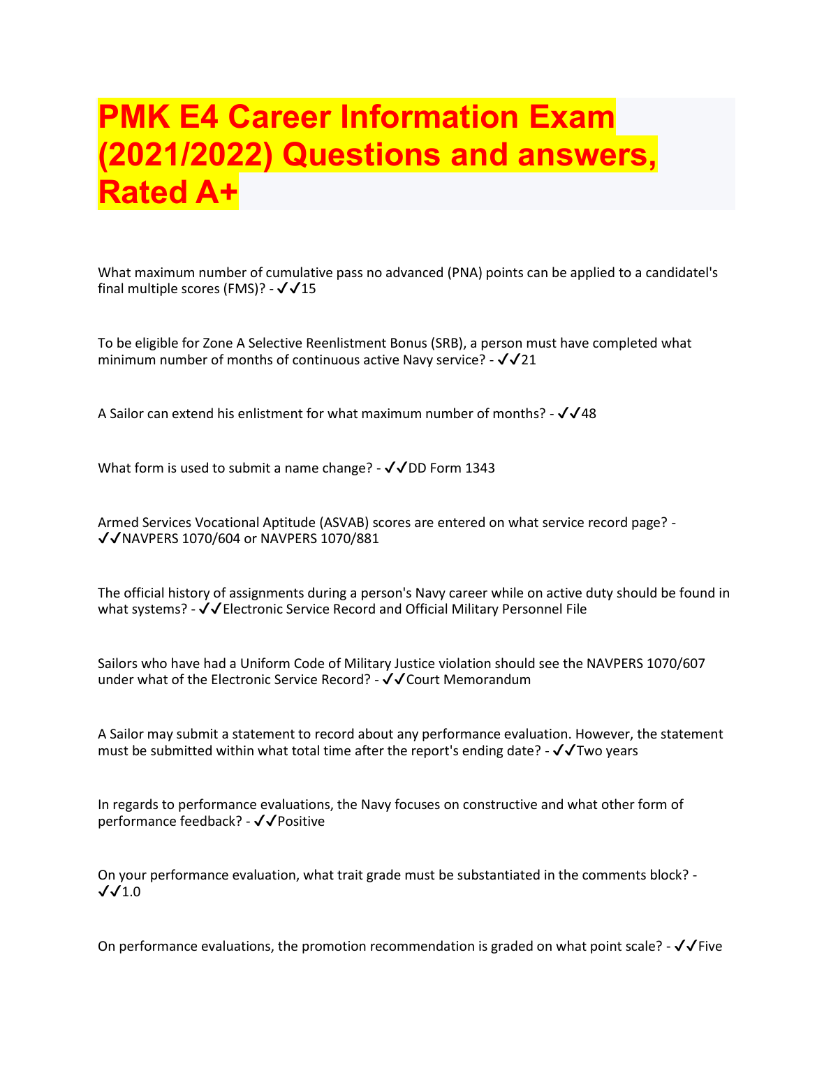 Ace your U.S. Navy advancement exam and secure your promotion to Petty Officer Third Class (E4) on your first try! This is the complete, A+ rated Test Bank for the PMK-EE E4 Career Information exam, updated for the 2025/2026 academic year. It features a comprehensive collection of exam questions with 100% correct, verified answers, covering all essential topics you need to know. Master key concepts related to reenlistment bonuses (SRB), service records (NAVPERS), and performance evaluations. Our meticulously prepared guide is designed to help you study efficiently, build confidence, and pass the PMK-EE E4 exam with flying colors, avoiding any resits. Download now to get the ultimate study resource for your Navy career advancement!
