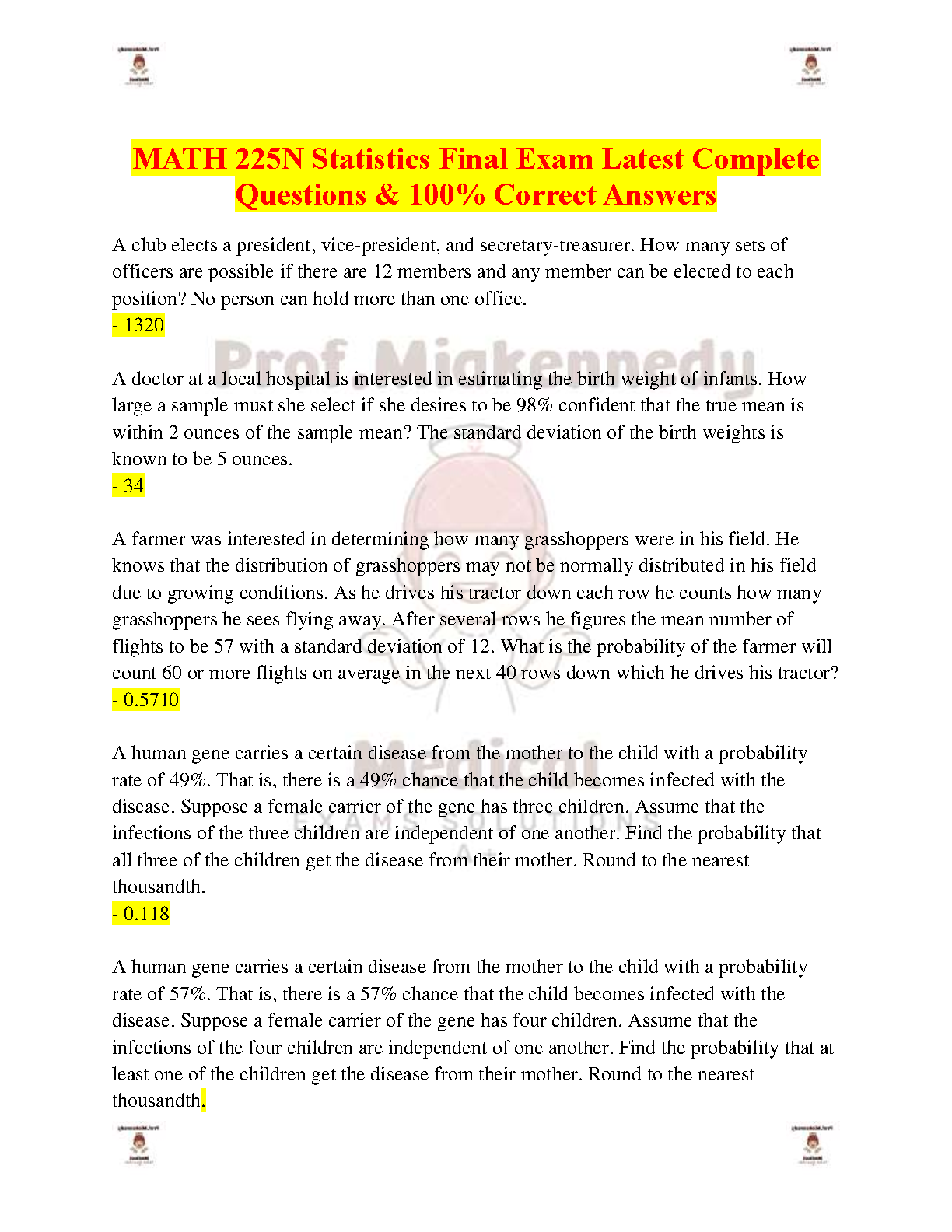 Ace your MATH 225N Statistics final exam with this comprehensive test bank. This study guide features a complete collection of the latest exam questions, each paired with a 100% correct, verified answer. Master key statistical concepts including probability, permutations, sample size determination, and confidence intervals. This resource is expertly designed to help you understand the material thoroughly, ensuring you are fully prepared to pass your final exam on the first attempt. Download now for immediate access to the ultimate study tool for MATH 225N.