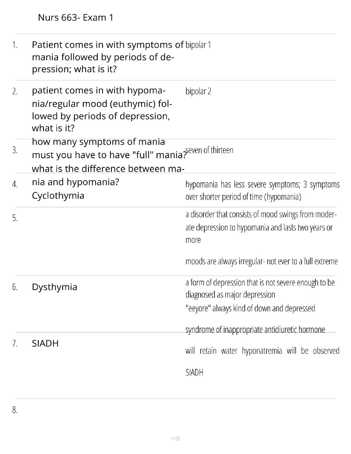 Master your NURS 663 Exam 1 with our latest 2025/2026 study resource. This guide provides in-depth elaborations and verified answers on crucial psychopharmacological concepts. Dive deep into topics such as Bipolar disorders, mood spectrums (mania, hypomania), cyclothymia, dysthymia, and SIADH. This essential tool is structured to ensure you grasp the core material, avoid resits, and achieve top grades on your first attempt.