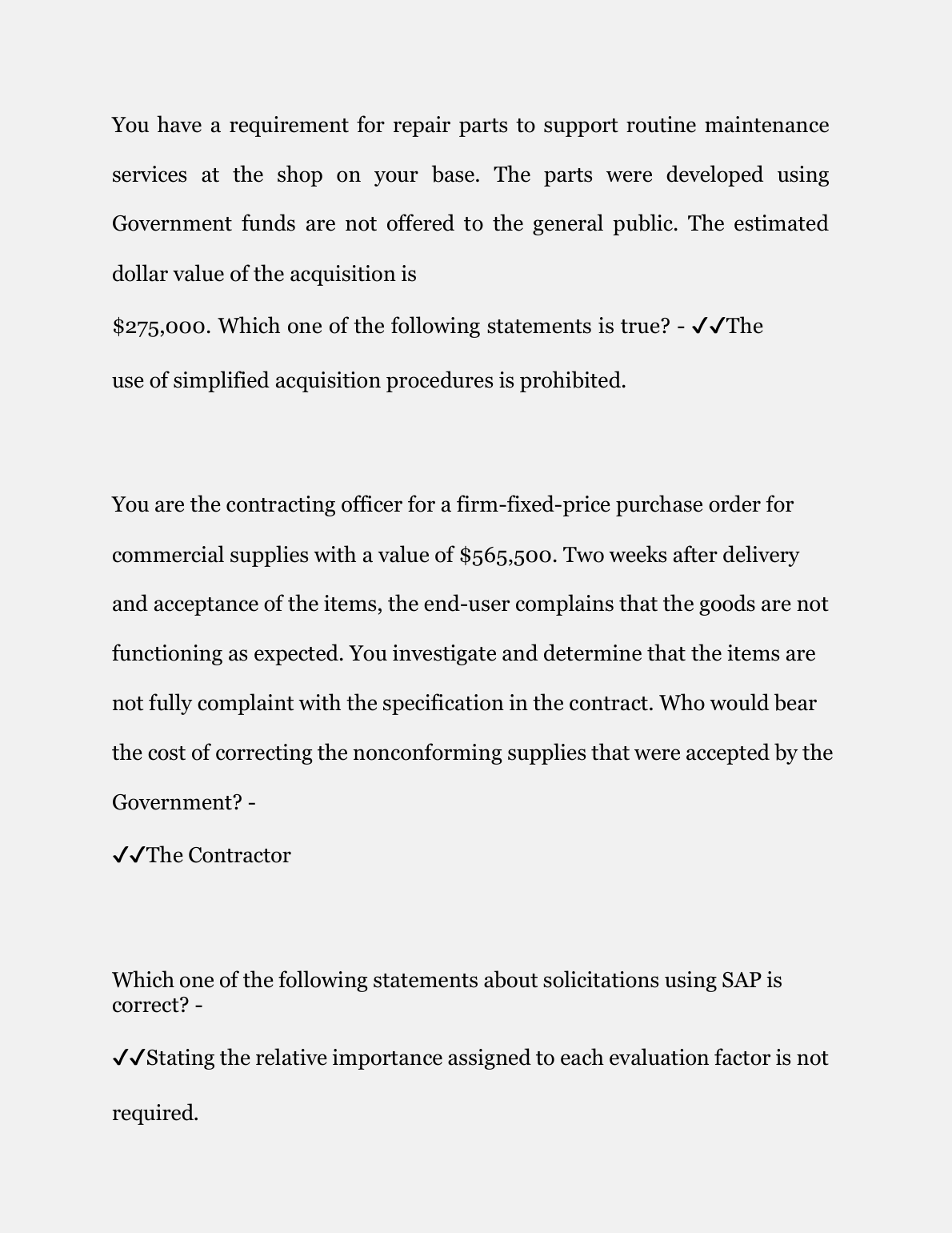 Master the complexities of government contracting with our latest 2025 Test Bank for CON 2370: Simplified Acquisition Procedures. This comprehensive resource is expertly designed to help you excel in your exam. It features a complete collection of real exam questions, each paired with a 100% accurate and verified answer. Dive deep into topics like contract closeout, purchase orders, and the core principles of SAP. Our study guide provides the clarity and practice you need to understand the material thoroughly and pass your CON 2370 certification on the first attempt. Get instant access to this verified study material and approach your exam with confidence.