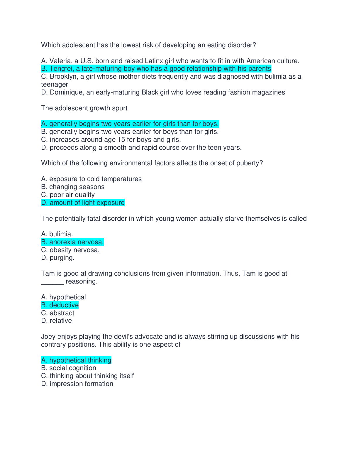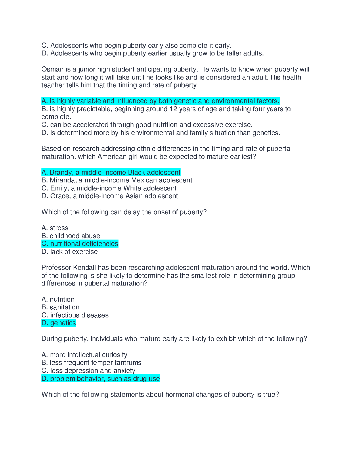 Unlock academic success in your HDFS 239 course with our meticulously prepared Exam 1 Test Bank. This essential study guide features a complete collection of quiz questions, complete with verified answers, covering crucial topics in adolescent development. Delve into the complexities of hormonal production at puberty, prenatal development, and the nuances of sexual maturation. This resource is expertly designed to help you grasp key concepts, streamline your study process, and confidently achieve a top grade on your first attempt. Download today to prepare effectively and excel in your examination!