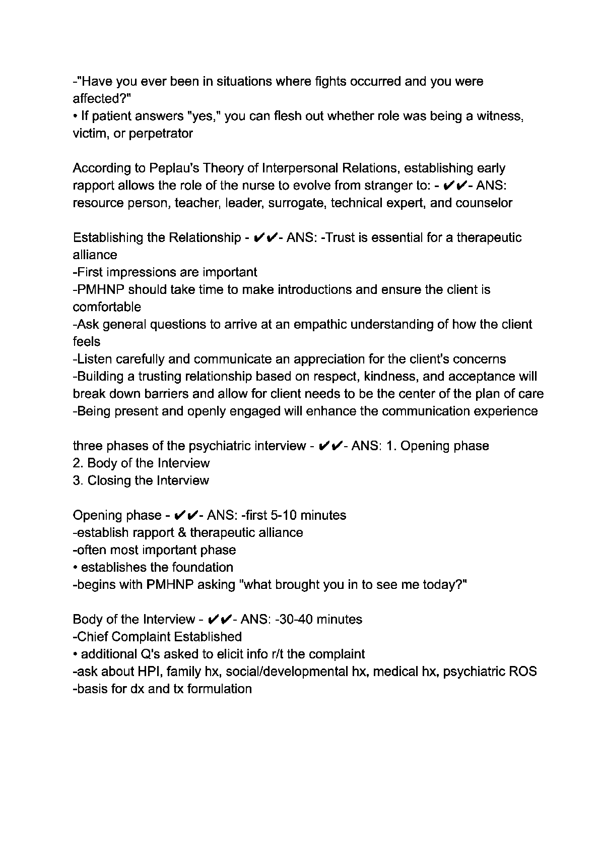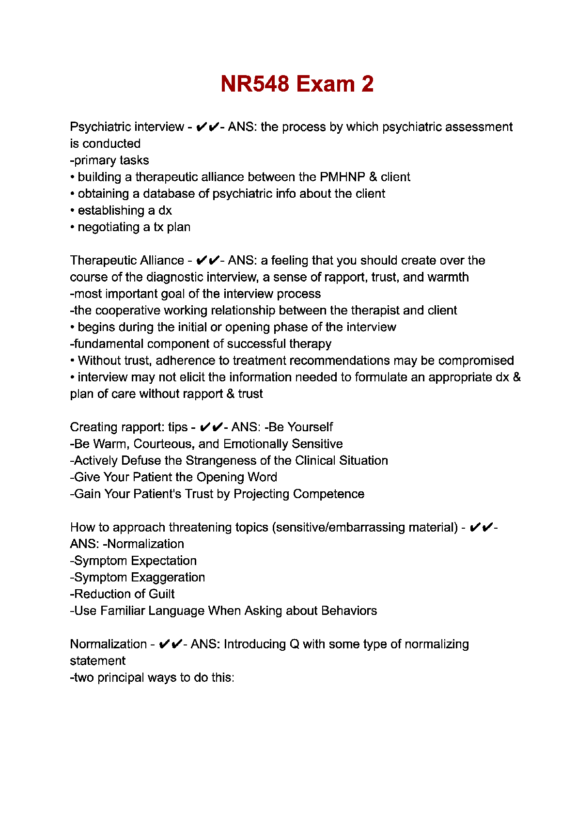 Ace your NR548 Exam 2 on the first try with this comprehensive study guide, fully updated for the 2025/2026 academic year. This guide provides detailed notes and answers on crucial topics for Psychiatric-Mental Health Nurse Practitioners (PMHNP). You'll master the fundamentals of the psychiatric interview, learn the art of building a strong therapeutic alliance, and discover effective techniques for creating rapport and trust with patients. It also covers strategies for navigating sensitive and threatening topics, including normalization and symptom expectation. Avoid resits and secure your A with this essential resource designed for exam success.