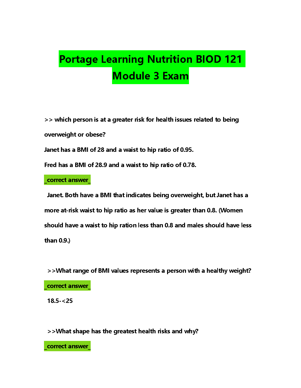 Unlock success in your Portage Learning BIOD 121 Nutrition course with our detailed exam elaboration for Module 3. This essential study resource features a complete set of questions and 100% verified correct answers, covering critical topics such as BMI calculations, healthy weight ranges, and the health risks of different body shapes. Designed to help you understand the concepts thoroughly, this guide is your key to passing the Module 3 exam with confidence on your first attempt and avoiding resits.