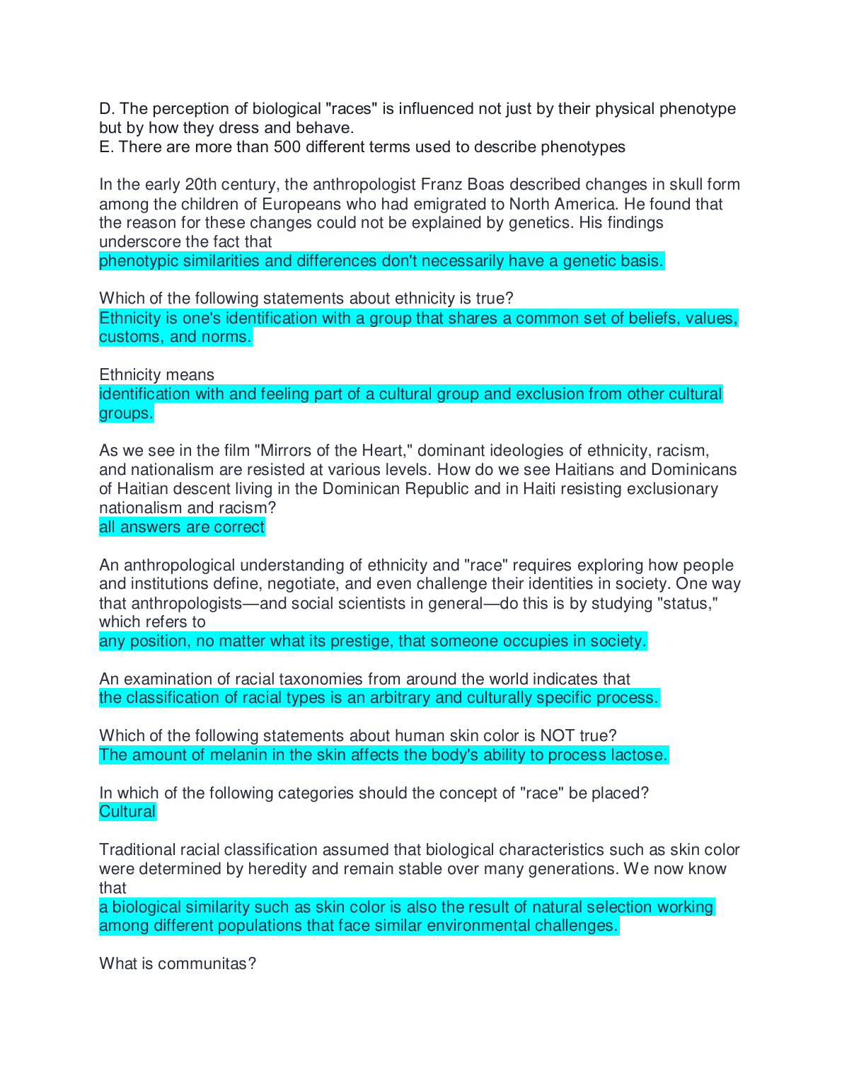 Ace your ANT 2410 Cultural Anthropology final exam with this comprehensive test bank for Exam 4. This essential study resource provides a complete set of questions along with their verified, correct answers, designed to cover all critical topics you'll face on the test. Dive deep into key anthropological concepts including the constructs of ethnicity and race, the dynamics of racism, multiculturalism, plural societies, and ethnocide. The material also includes questions related to the film 'Mirrors of the Heart,' ensuring you're fully prepared for every aspect of the exam. Stop guessing and start studying with confidence. This test bank is your key to mastering the material and securing a top grade.