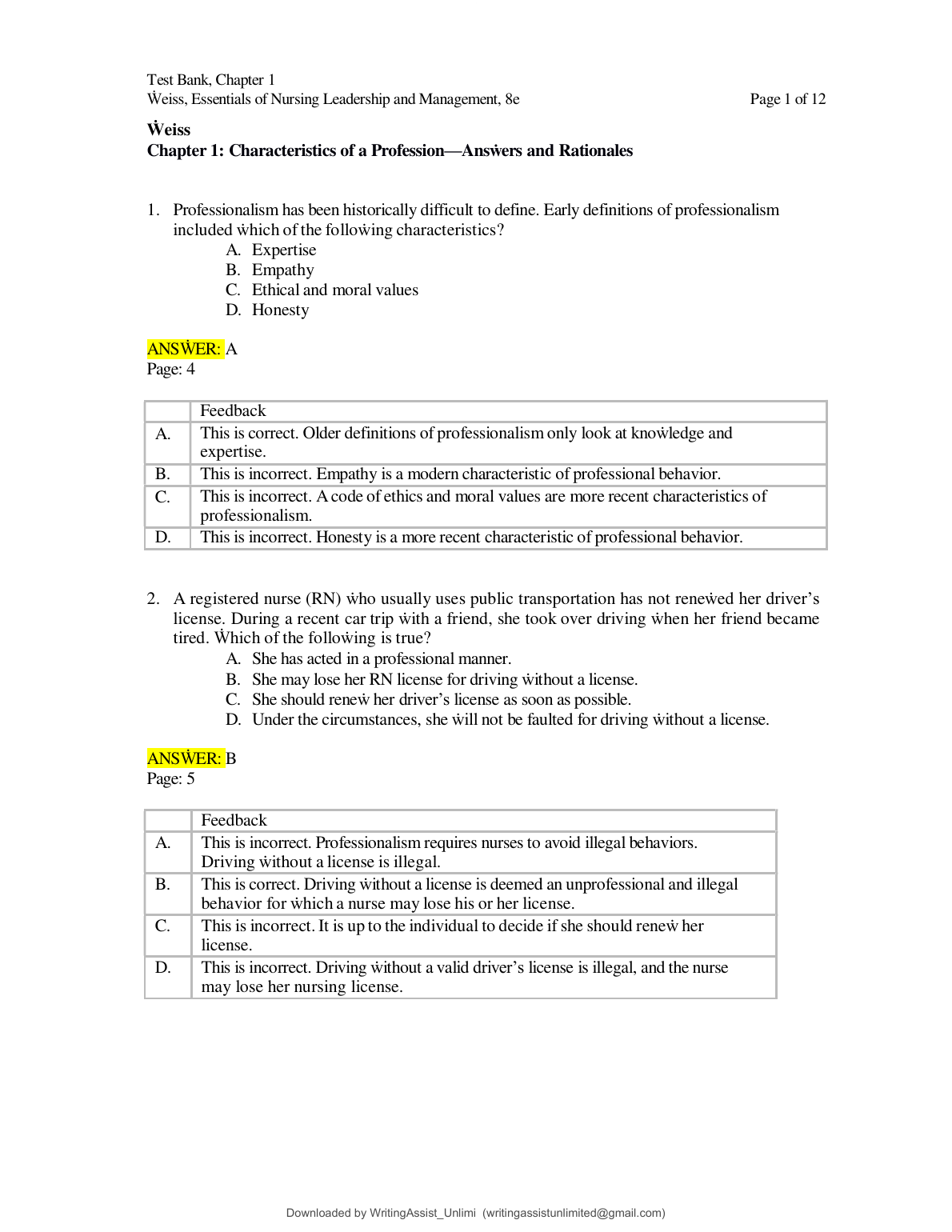 Test Bank for Essentials of Nursing Leadership and Management, 8th Edition by Patricia Kelly & Sally A. Weiss (Chapters 1-16)