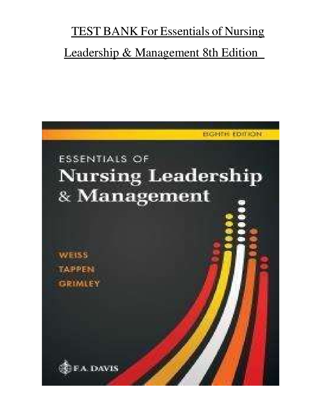 Achieve academic excellence with the definitive Test Bank for the 8th Edition of Essentials of Nursing Leadership and Management by Kelly and Weiss. This complete study guide covers every chapter from 1 to 16, offering an extensive range of multiple-choice questions, detailed rationales, and correct answers. It's the ultimate tool for nursing students aiming to deepen their understanding, test their knowledge, and prepare effectively for exams. Download now to boost your grades and master the core principles of nursing leadership.