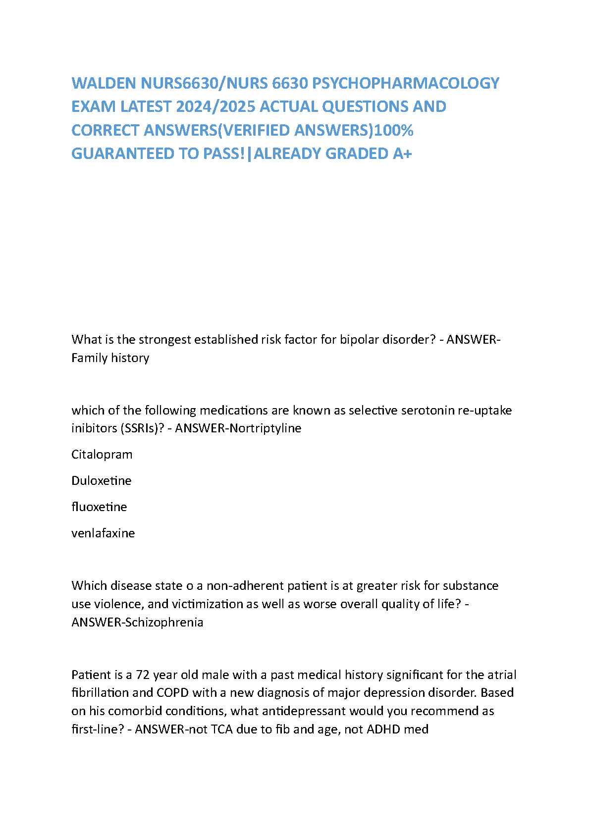 Ace your NURS 6630 Psychopharmacology exam at Walden University with this comprehensive test bank. This essential study guide features a complete collection of the latest 2024/2025 actual exam questions, each accompanied by a detailed, verified correct answer. Dive deep into key psychopharmacology topics, including mood disorders, antidepressants, antipsychotics, and patient-specific treatment plans. Our resource is designed to give you the confidence you need to pass on your first attempt and achieve an A+ grade. Stop guessing and start studying with a proven tool for success in NURS 6630.