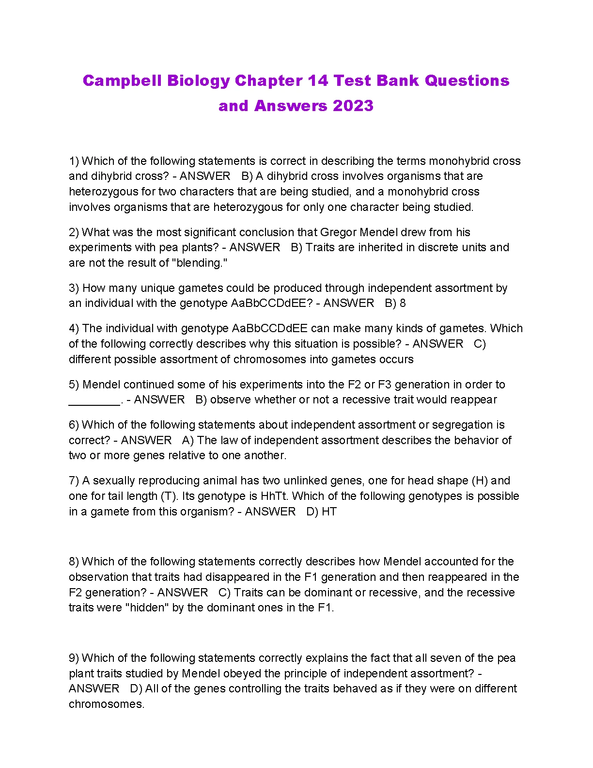 Test bank for Campbell Biology Chapter 14 Questions and Answers 2023