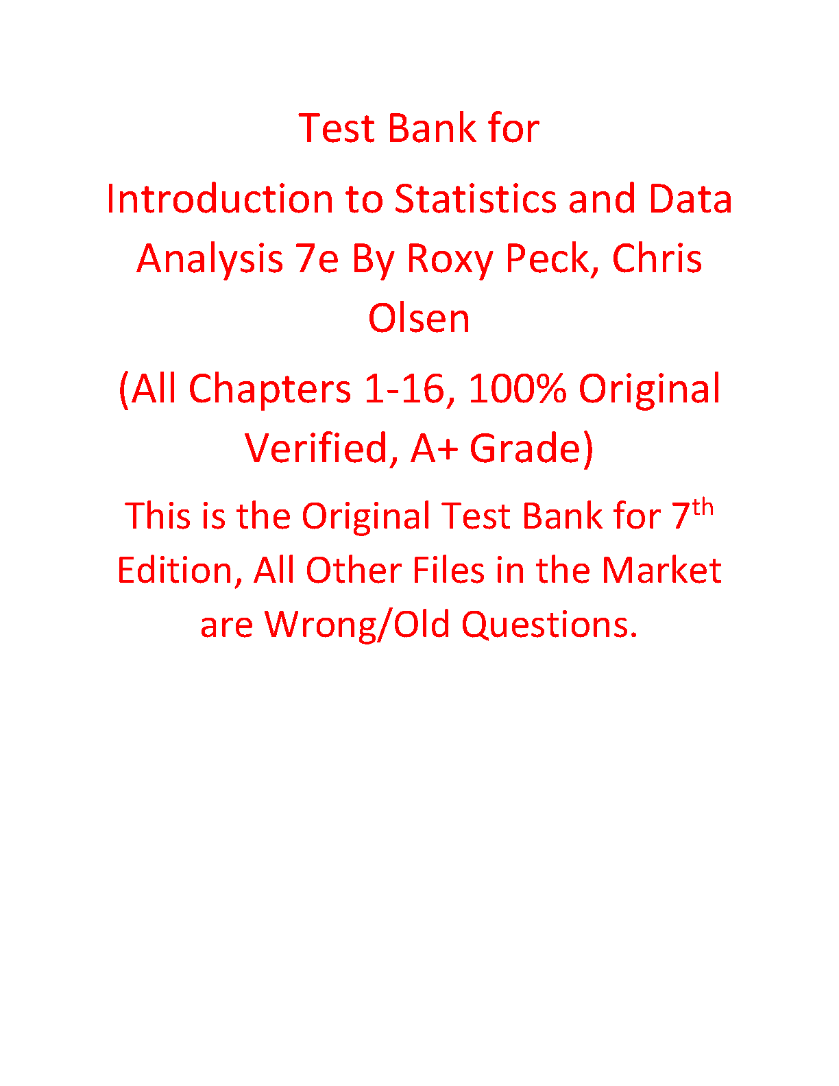 Achieve top grades with the official Test Bank for 'Introduction to Statistics and Data Analysis, 7th Edition' by Roxy Peck, Chris Olsen, and Jay L. Devore. This comprehensive resource covers all chapters (1-16) and is 100% verified for accuracy. It provides a wide range of questions designed to test your understanding, prepare you thoroughly for exams, and help you master key statistical concepts. This is the authentic, original test bank you need to excel in your course.