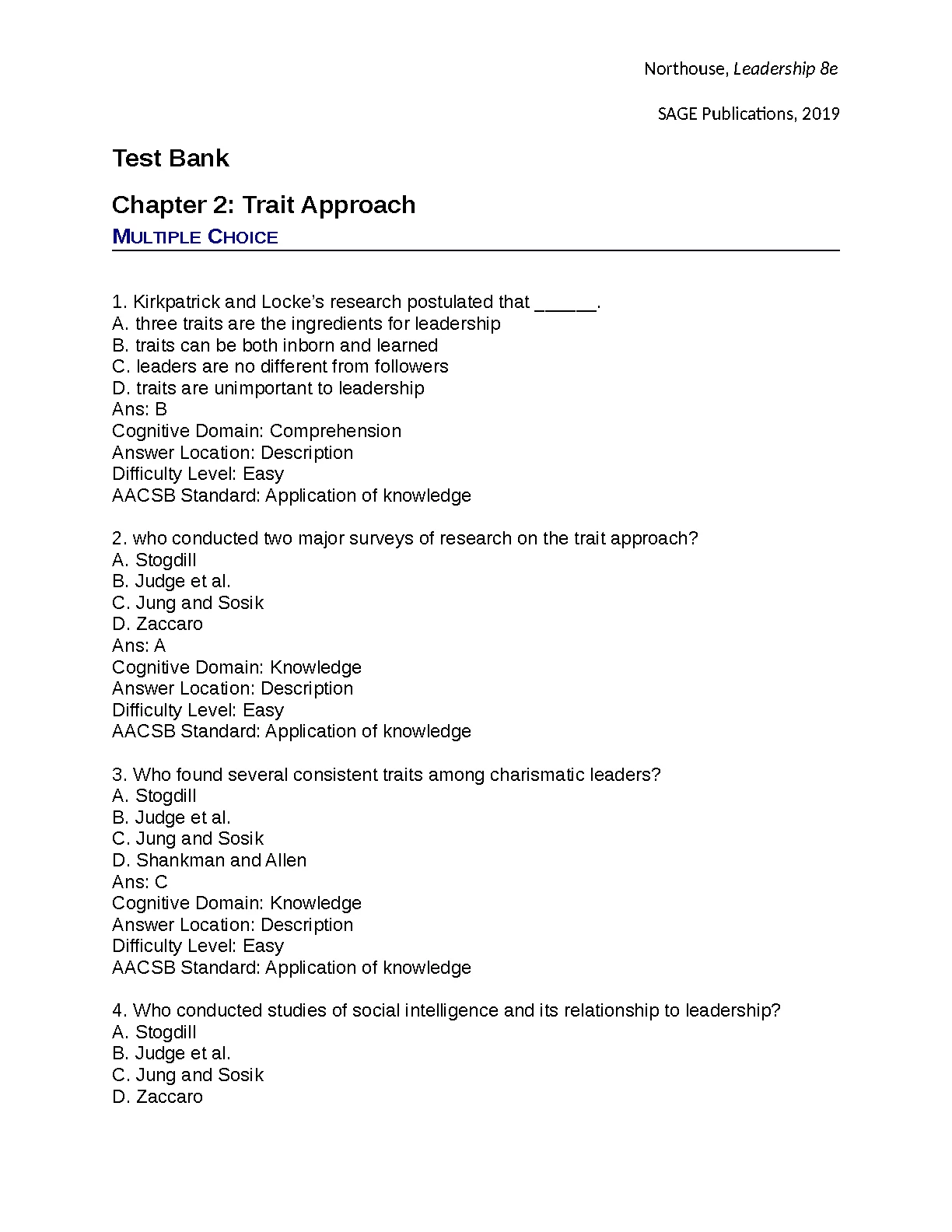 Test Bank For Northouse, Leadership 8th Edition SAGE Publications (Chapter 2: Trait Approach). DOWNLOAD on www.hackedexams.com INSTANTLY.