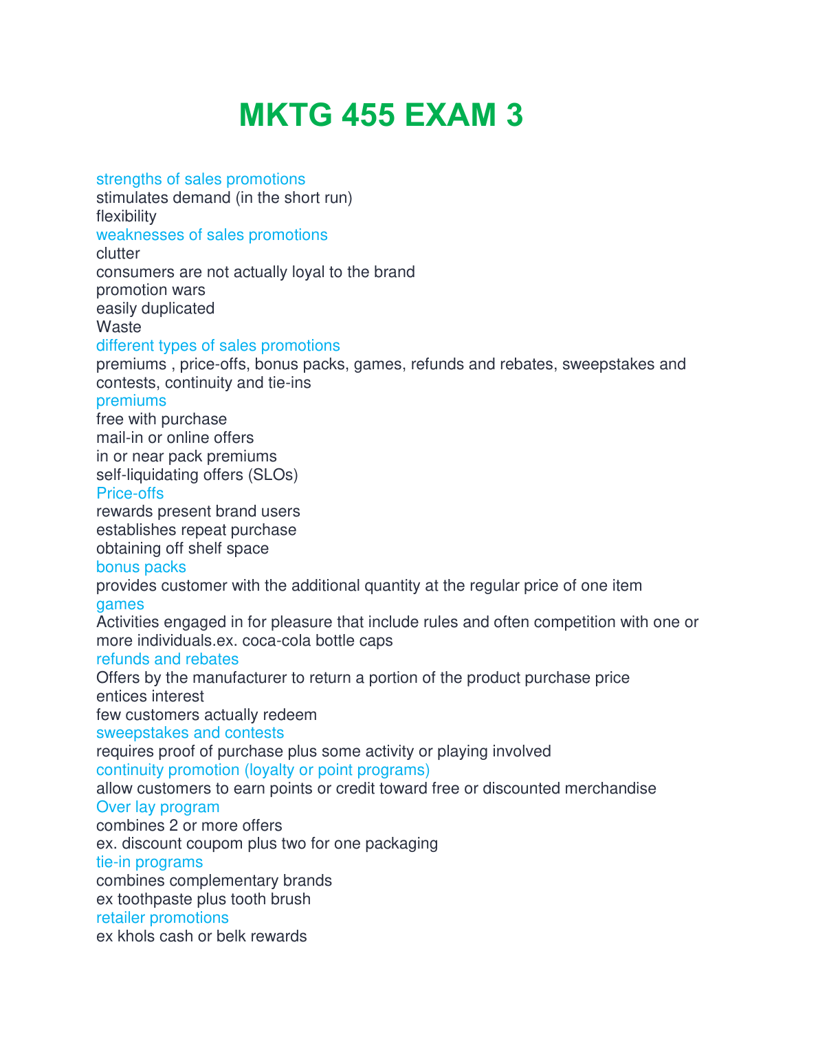 Unlock success in your Marketing course with our comprehensive study guide for MKTG 455 Exam 3. This latest 2025/2026 resource is expertly designed to help you master the crucial topic of Sales Promotions and pass your exam on the first attempt. Dive deep into the strengths and weaknesses of promotional strategies and get clear, concise definitions for every type of sales promotion, including premiums, price-offs, bonus packs, games, refunds, rebates, sweepstakes, contests, and loyalty programs. Stop stressing and start studying smart with this essential guide to acing your exam!